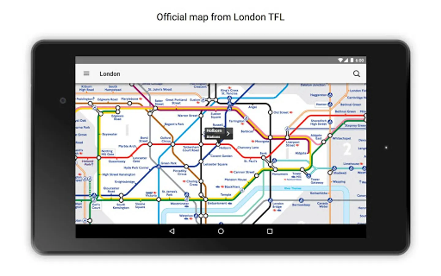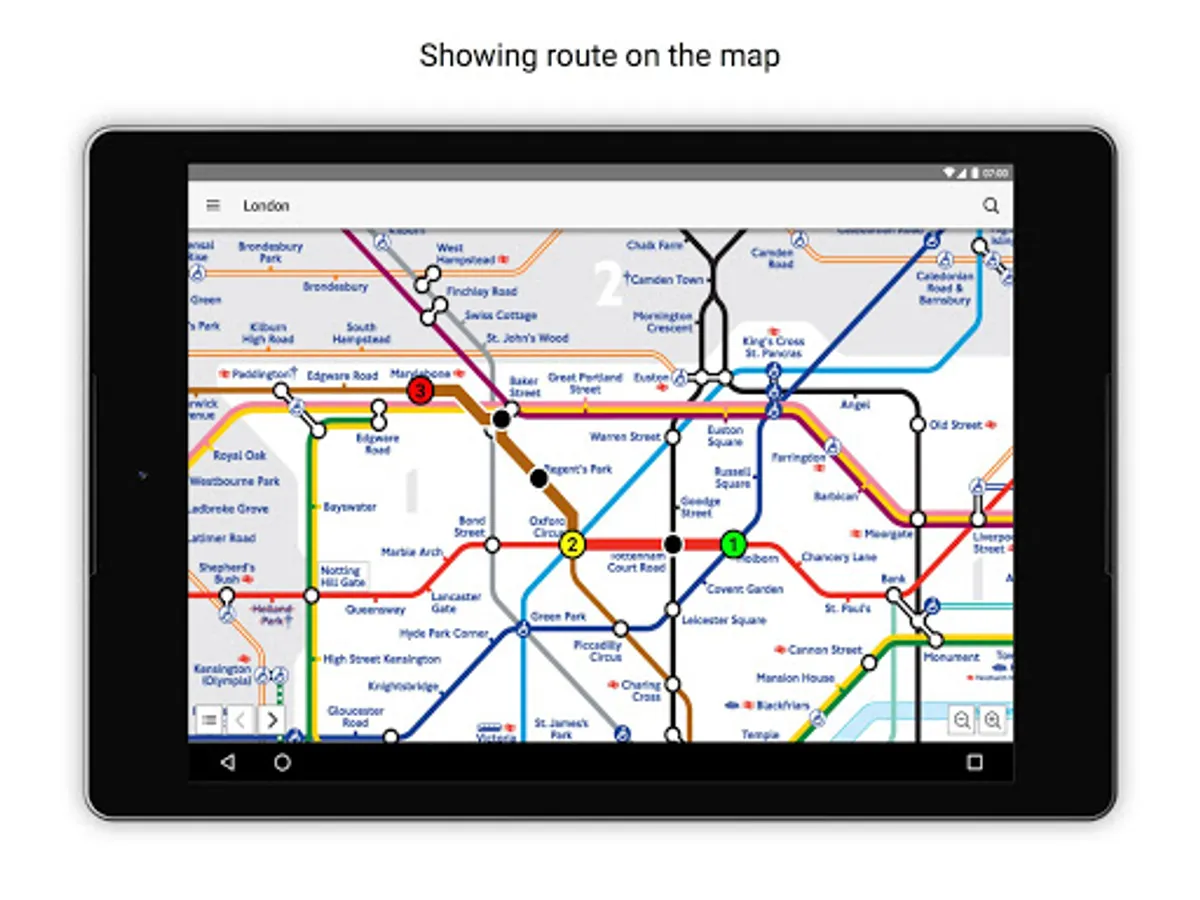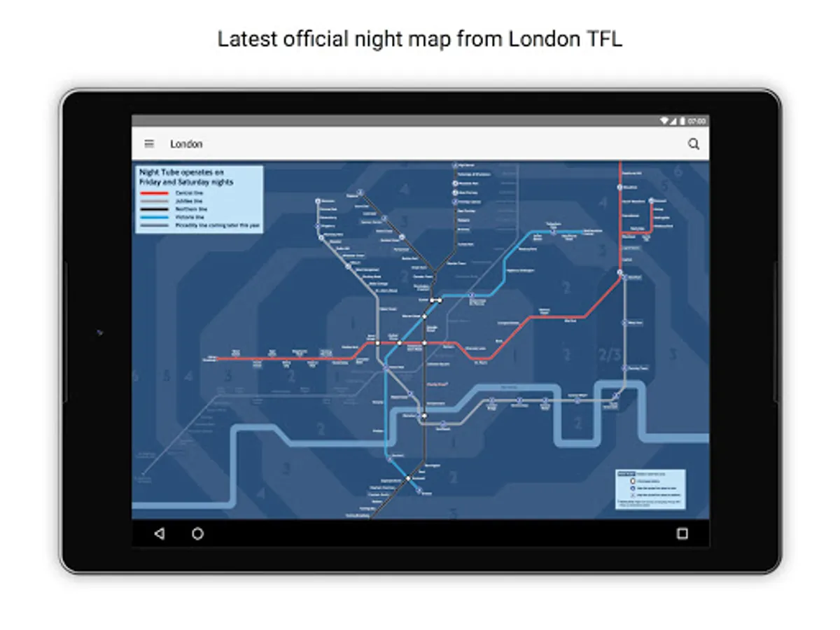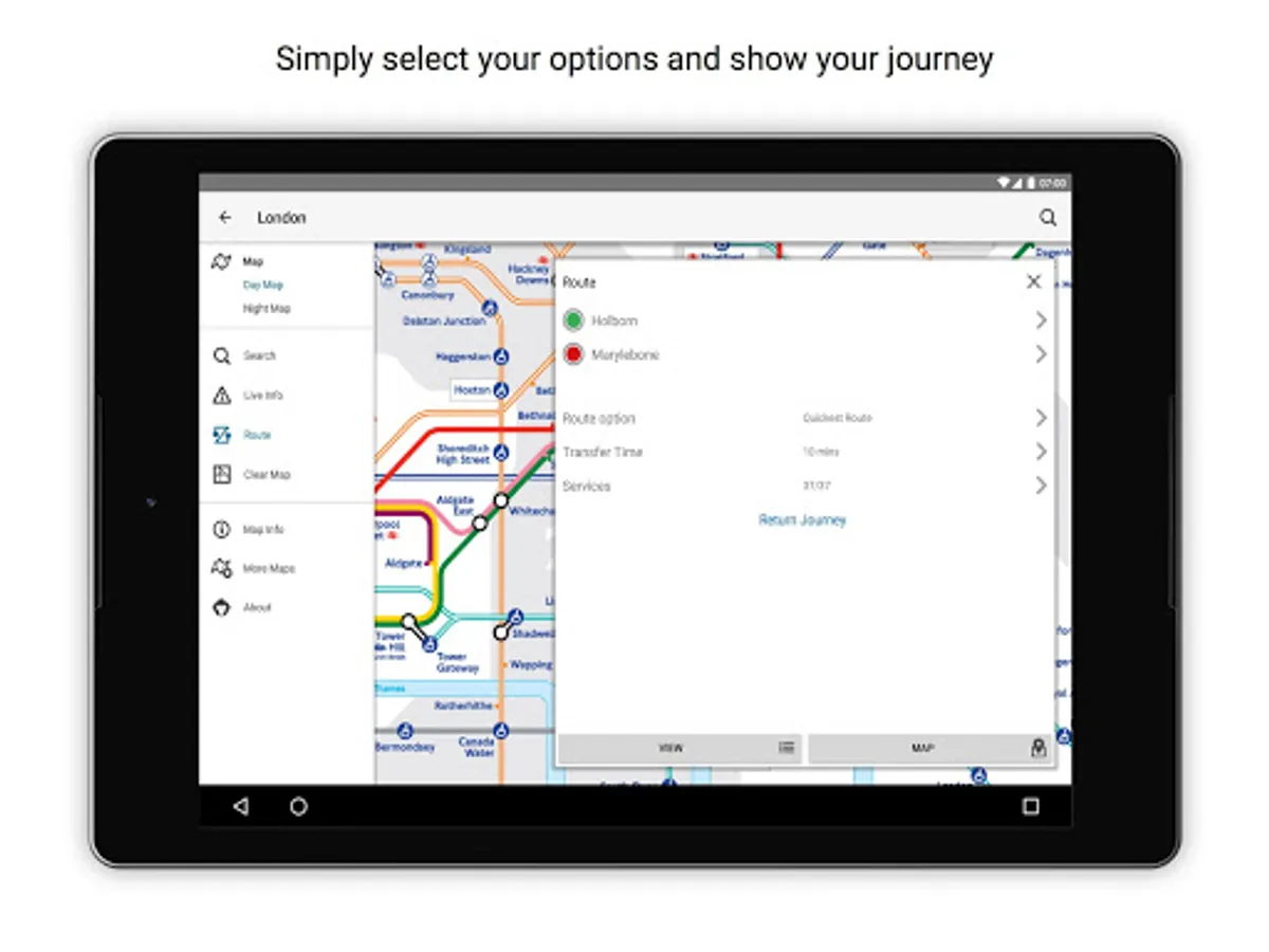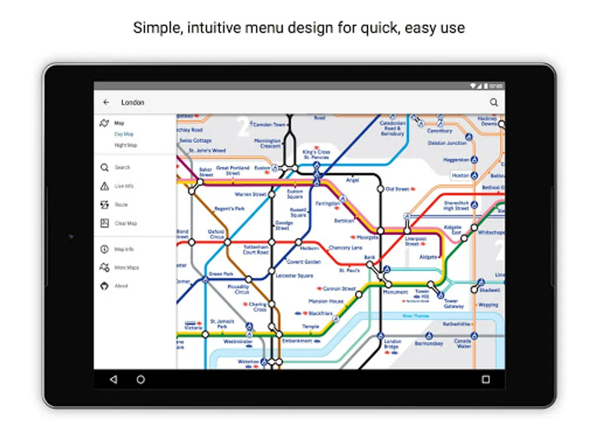 ● OVERVIEW ● The London Tube Map application is a superb route planner for the London Underground (Tube)system with many unique features. The inbuilt map provides the official TFL map of the city underground services with the ability to switch to an online street map view when an internet connection is available. This way the user can view the online map feature when above ground and the transport map and route planning is still fully functional underground or anywhere there is no internet connection. This provides the best of both worlds, the transport map and route planning anytime, anywhere and online street maps and search when a connection is available.
