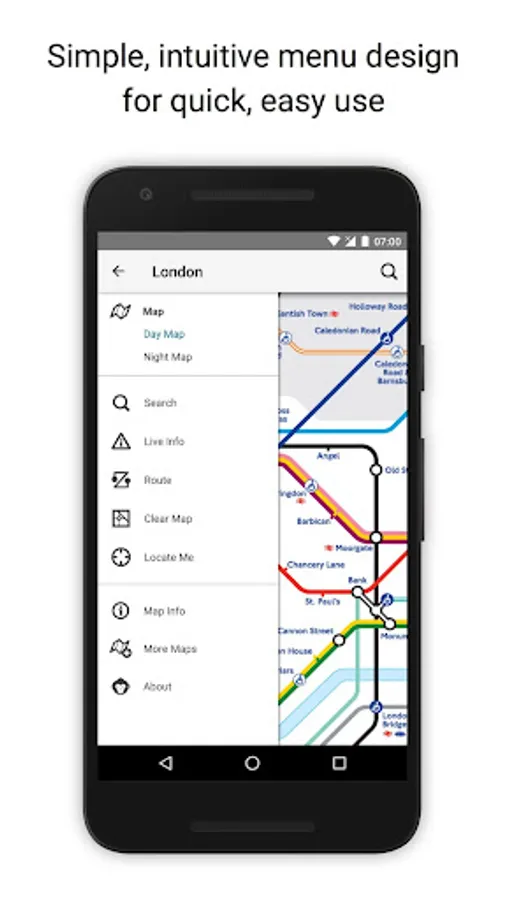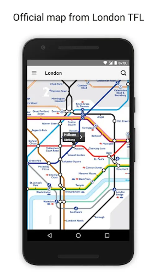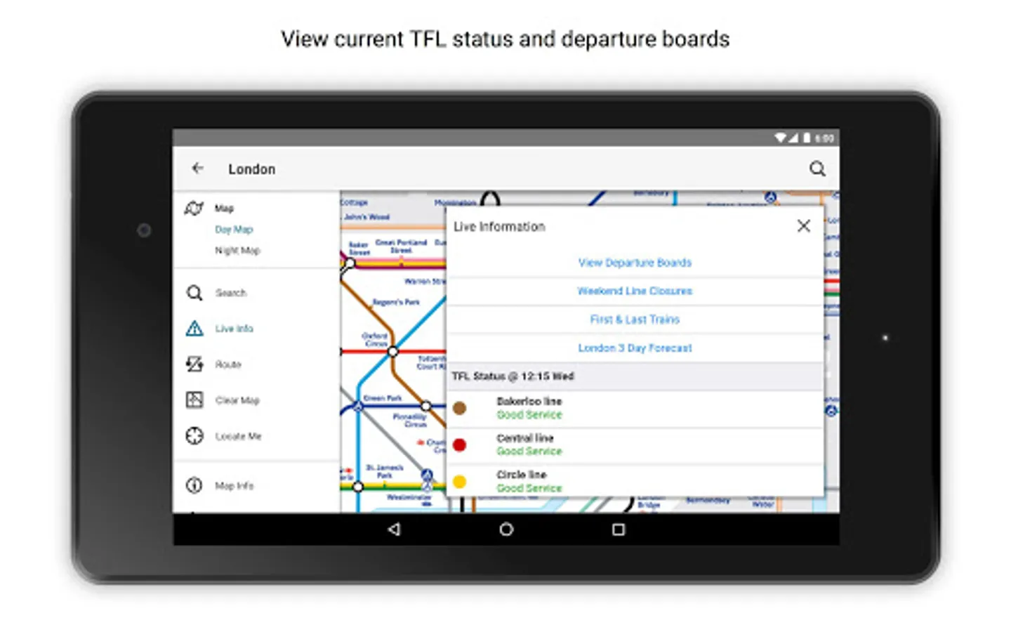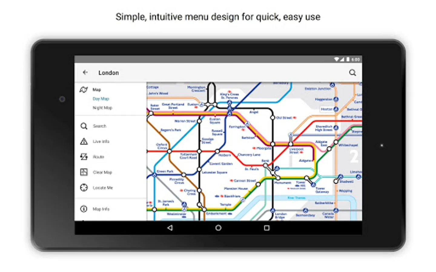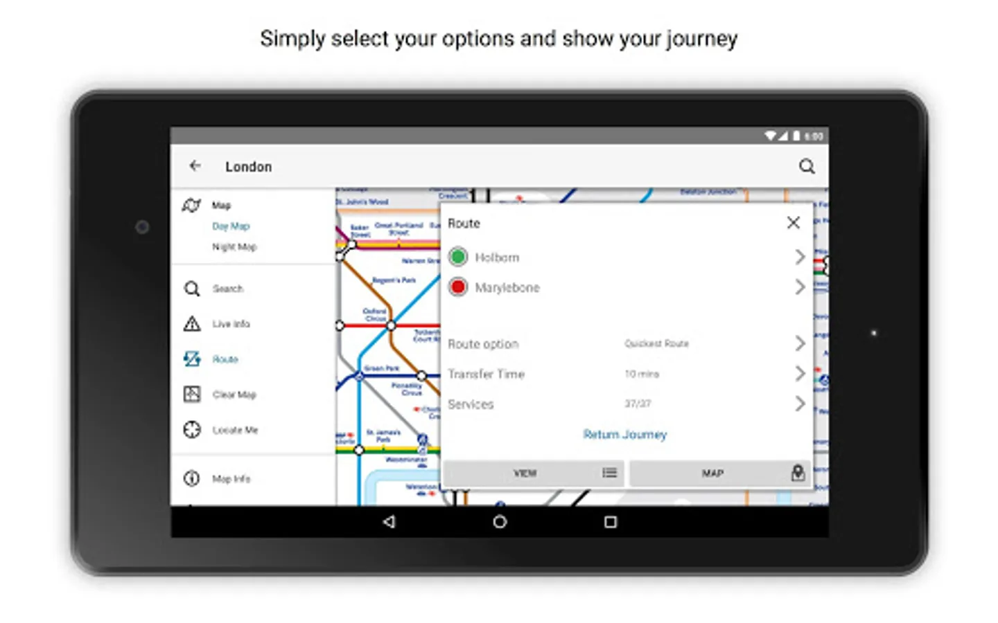 ● OVERVIEW ● The London Tube Map application is a superb route planner for the London Underground (Tube)system with many unique features. The inbuilt map provides the official TFL map of the city underground services with the ability to switch to an online street map view when an internet connection is available. This way the user can view the online map feature when above ground and the transport map and route planning is still fully functional underground or anywhere there is no internet connection. This provides the best of both worlds, the transport map and route planning anytime, anywhere and online street maps and search when a connection is available.