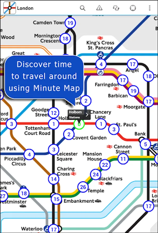● MINUTE MAP ● This unique feature provides a view of travel times from any location on the map. This is helpful for getting a sense of scale and connectivity of the transport system and can provide some interesting results.