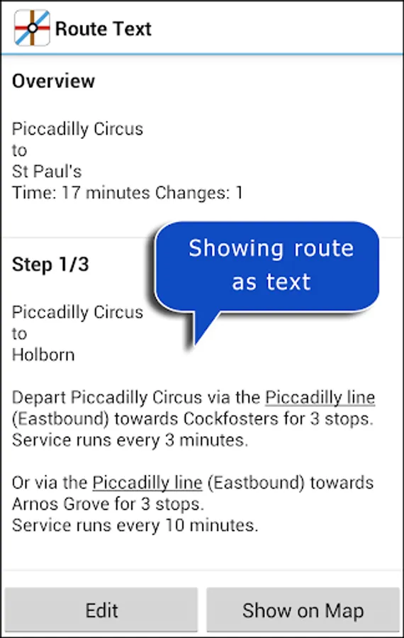 Comprehensive details of your planned route are provided, including changes, directions of travel, number of stops, predicted journey times, etc. Uniquely this application gives you “direction”, “towards” and “service frequency” information (not available on any other offline journey planner) for example “Take the Northern line (Southbound) towards Stockwell for 10 mins (6 stops). Service runs every 7 minutes” which is essential when finding the correct platform and connection. Also given are alternatives for each leg of the journey.