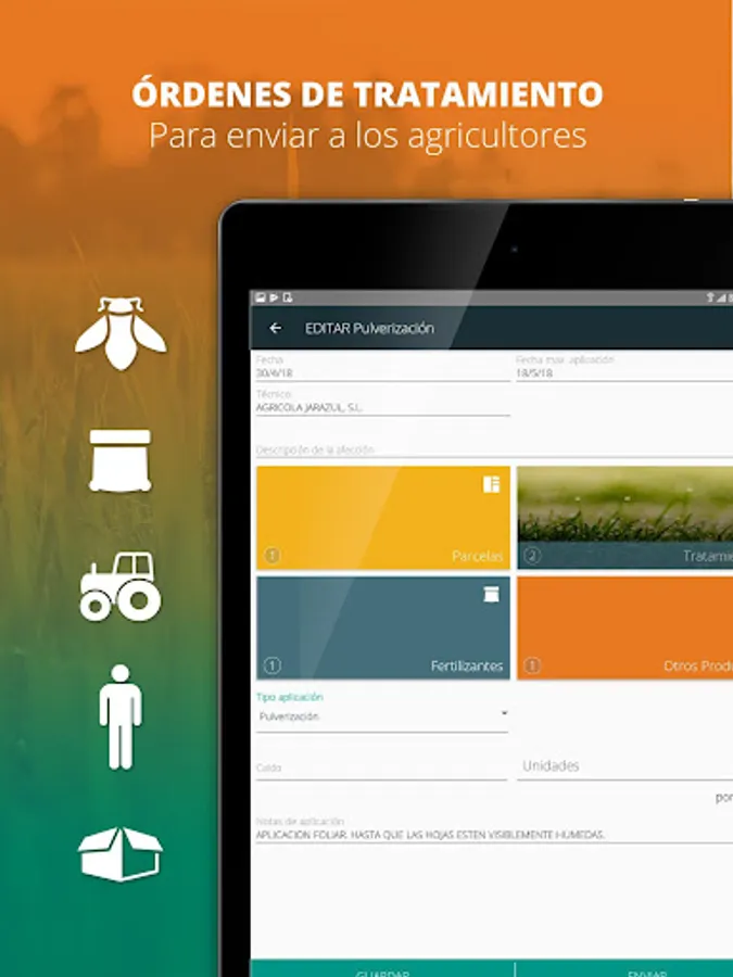 VISUAL APP is intelligent technology based on interactive maps that allows an efficient and profitable planning of field activities (planting, harvesting, irrigation, quality control, fertilization, monitoring of phenological stages, pest control treatments, among others).