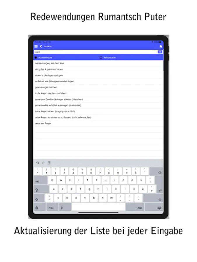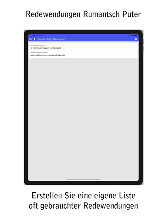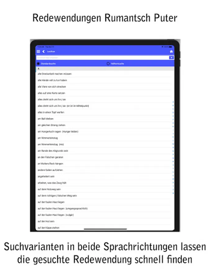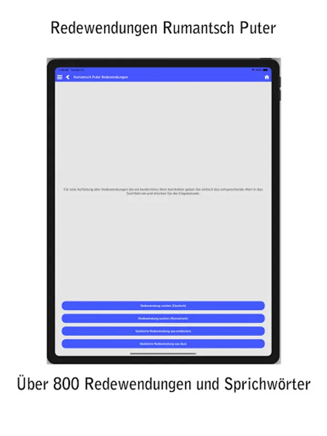 The app "Words Romansh turkey" includes about 800 phrases from everyday life. Words can be searched and selected by entering search words in both languages.