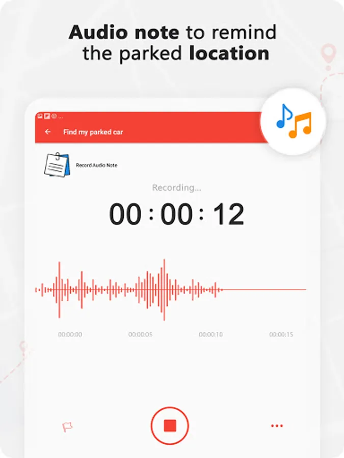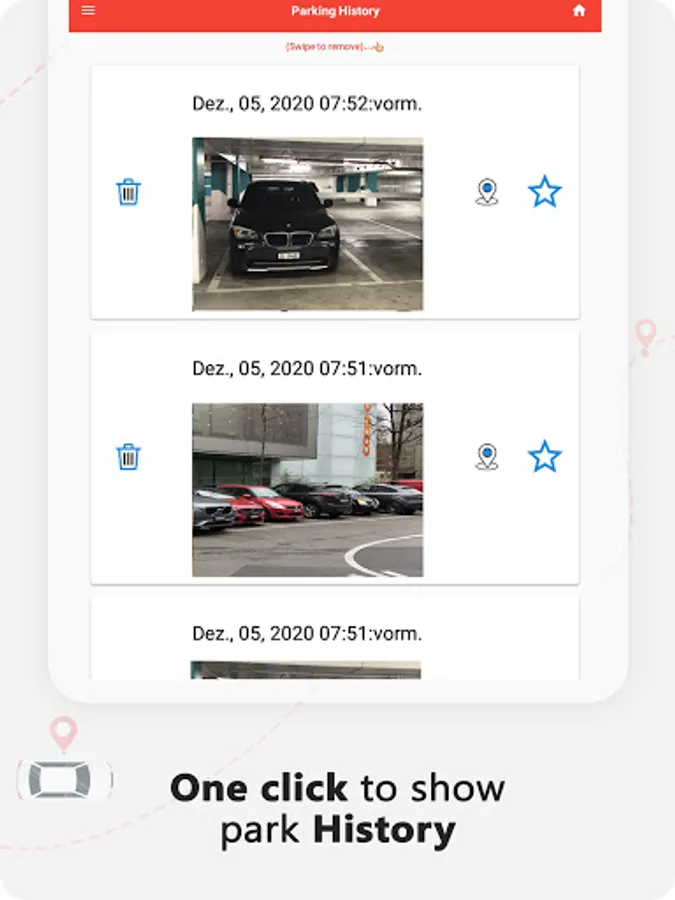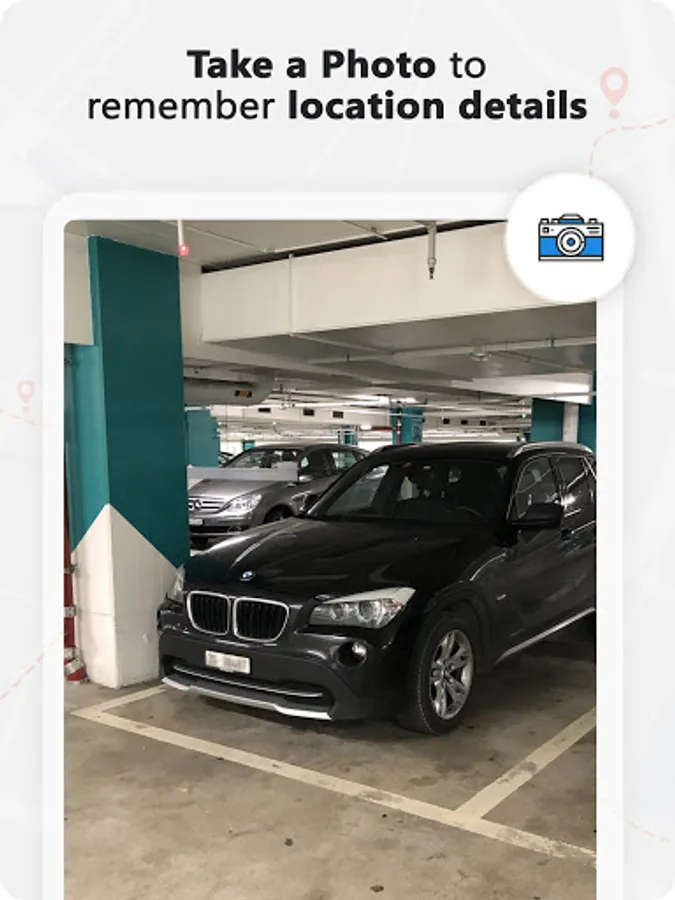 Assume you have parked your car in a garage. Tap on the camera and take a photo with helpful details: parking level, numbers, letters or colored area. Use prominent points or helpful objects to