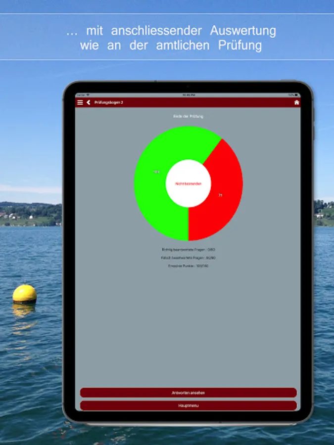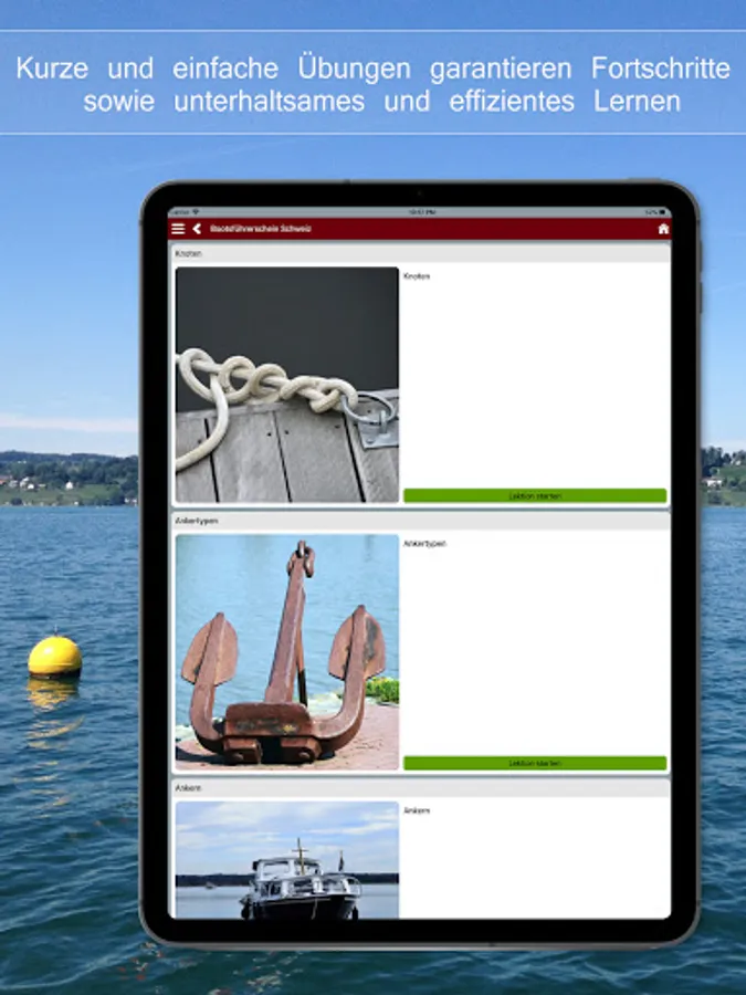 The complete solution includes the entire subject matter, which is necessary for the official theory test as well as numerous further lessons and exercises. Also included are questions about the transboundary waters and reference to the whole book, "Have a good trip on Swiss waters" and other statements about the shipping.