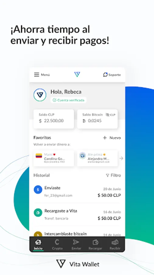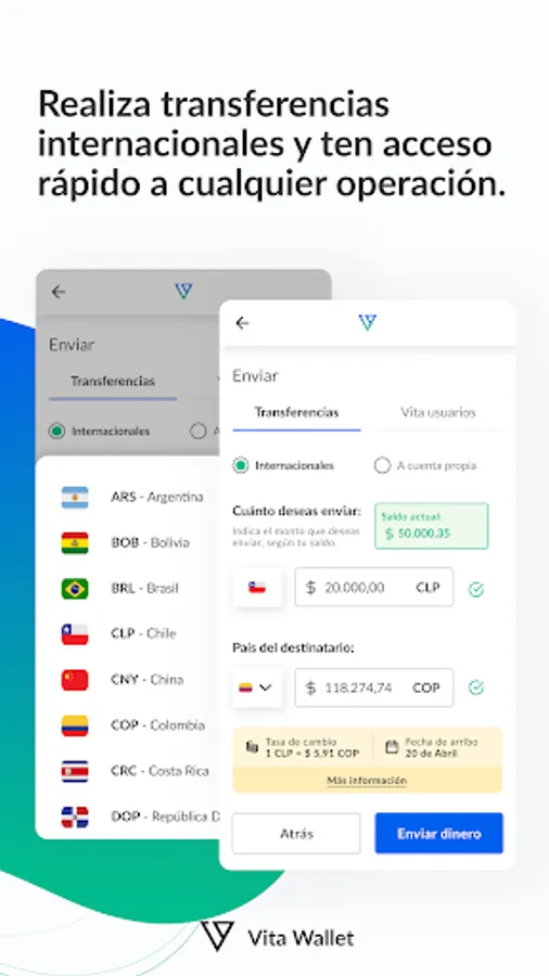 Vita Wallet is a digital wallet that allows you to send and receive international payments to more than 50 countries with competitive rates, availability times of less than 24 hours, and transparent costs.