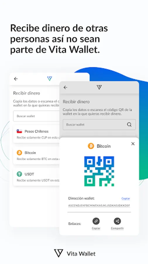 - Send or receive money between Vita Wallet users in a matter of minutes using only email or QR code.