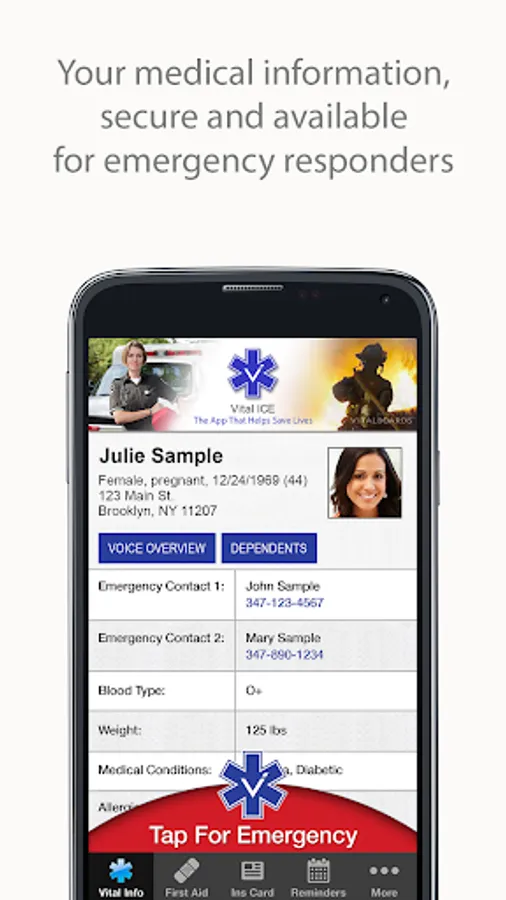 EMS and First Responders play a critical role in any life-threatening emergency situation. Any medical information for the patient that can be provided to them upon their arrival increases the odds of a more favorable outcome. Time saves lives, and Vital ICE saves time.
