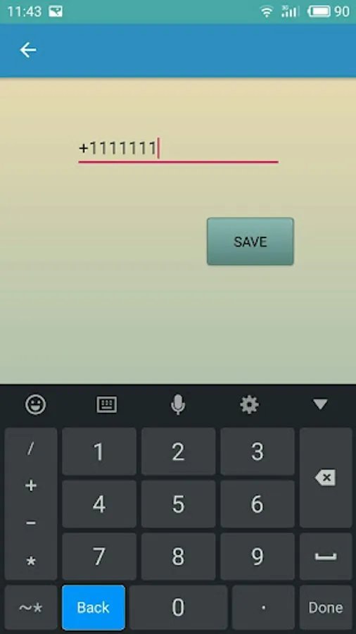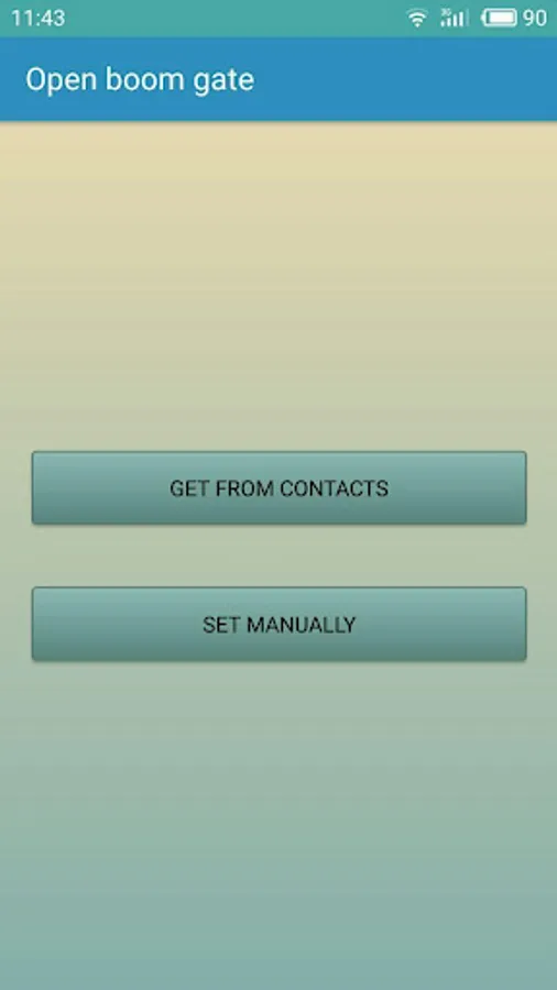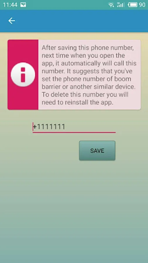 When you will run this app the first time, enter manually or select from the phone book a phone number of your boom barrier. Then press the "Save" button, the app will be automatically quit.
