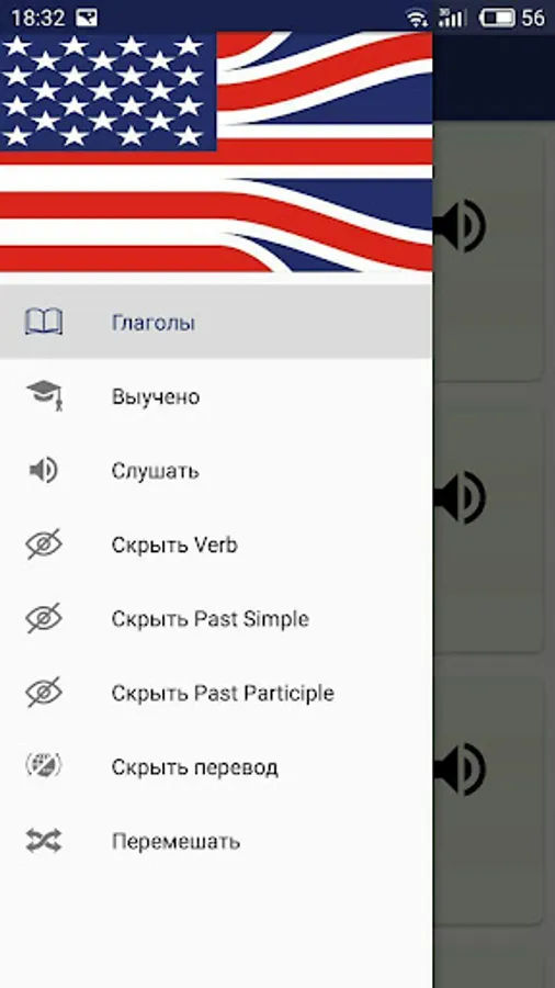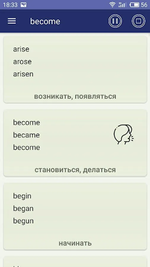 Learn to understand irregular verbs by ear, for this, go to the "Listen" tab, a nice woman announcer will help you learn how to pronounce irregular verbs, one by one from the list.