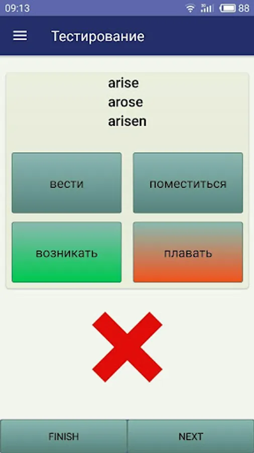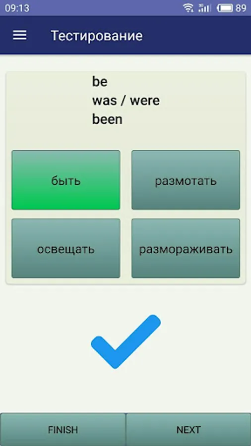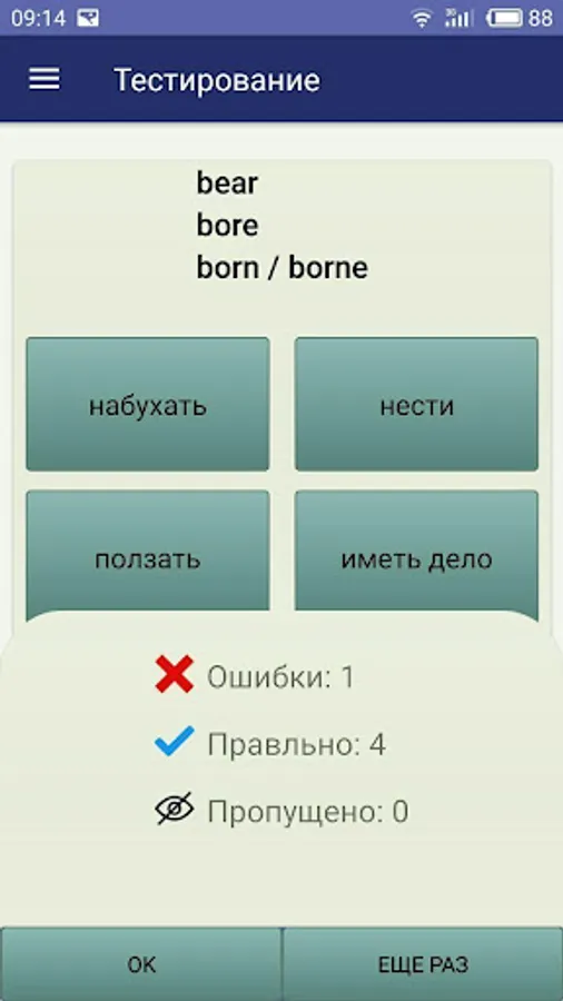 Check and consolidate the knowledge of already learned irregular verbs in the quiz mode on the "Test knowledge" tab.
