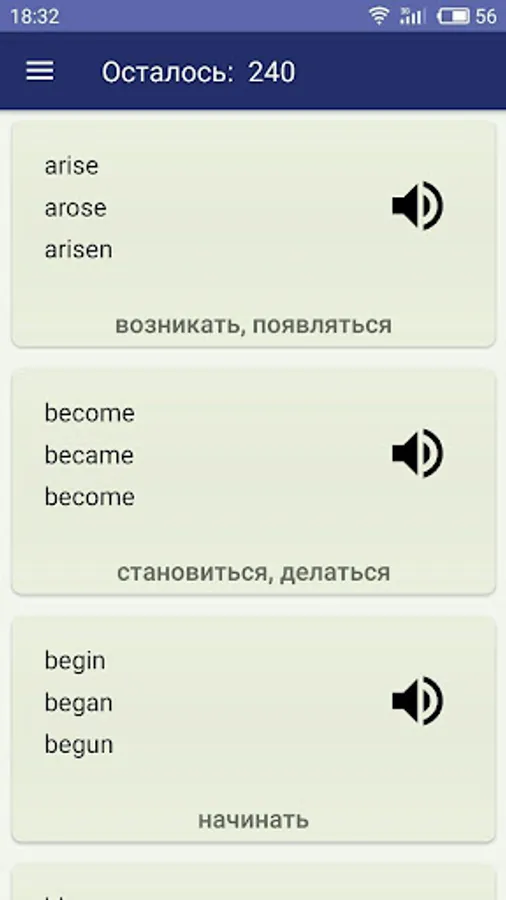 Our application will help you easily learn the 240 most common, irregular English verbs. Having mastered them, you get as close as possible to native English speakers.