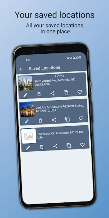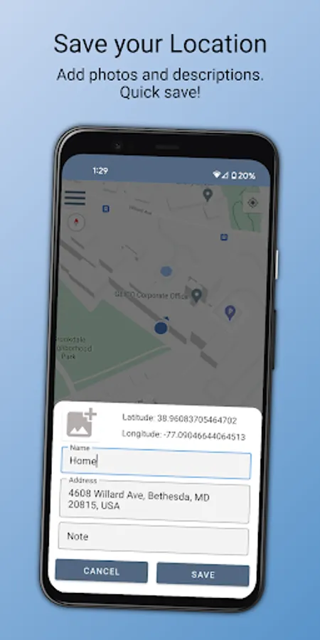 Are you always forgetting places you visited and often ask yourself, where is your car parked? Our app Save Location GPS will ease your life. Open the location saver app, wait for a few seconds to get your current location, and press «save». It's all, now you may always check this place in the future. Do you need to save a location nearby? Long press on the map open saving options with the current address and coordinates. Even if you have a weak network connection, the app any way saves your location latitude and longitude