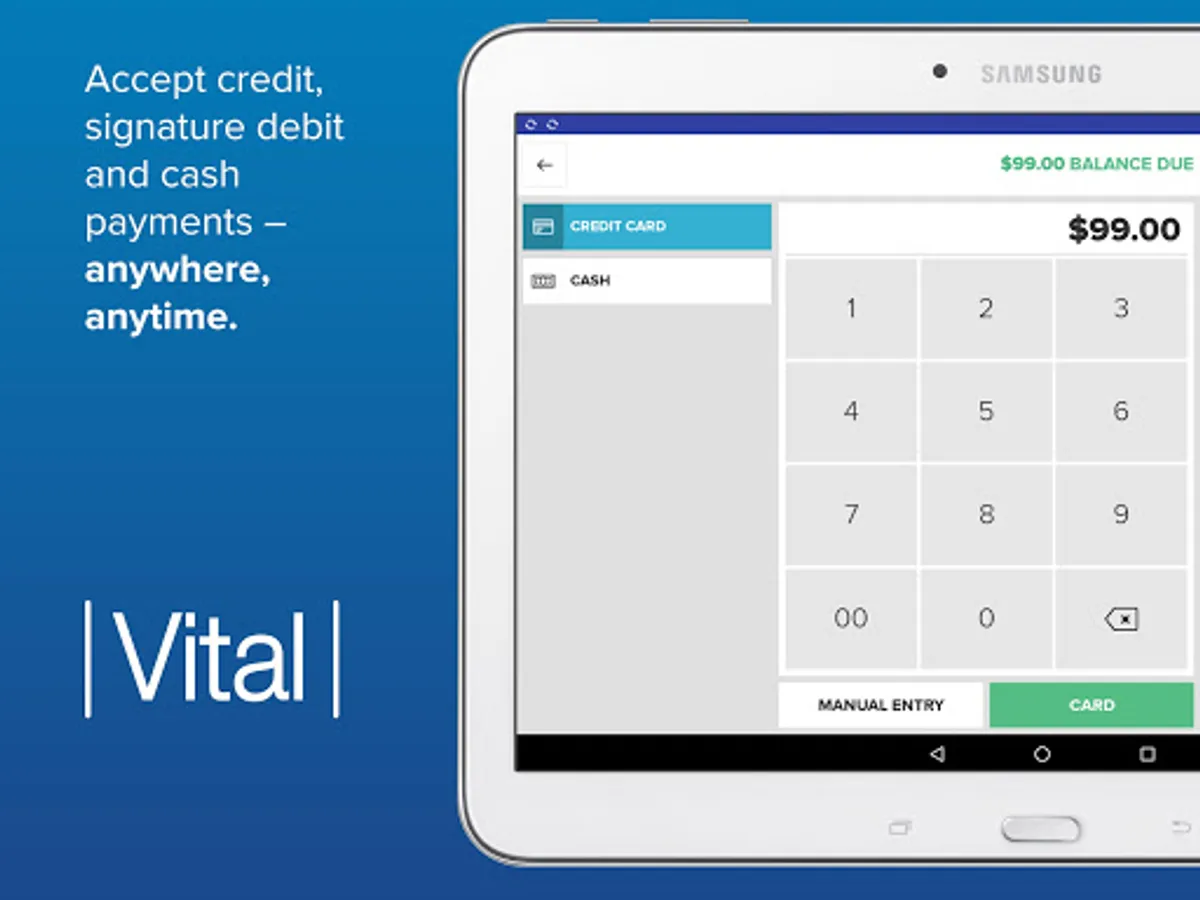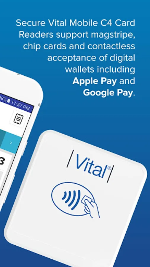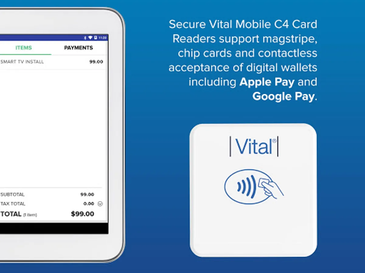 Vital Mobile is an easy-to-use, point-of-sale App that allows you to run your business and accept customer payments - anytime, anywhere. With Vital Mobile, you can accept and track all of your customer payments. Paired with the Vital C4 Card Reader, Vital Mobile securely accepts all major credit and signature cards whether they are swiped, dipped or contactless tap and go. This includes payment acceptance from most digital wallets such as Apple Pay and Google Pay.