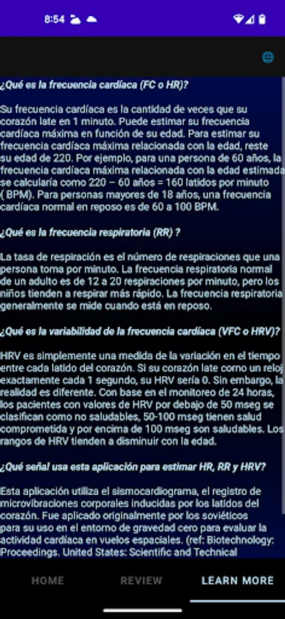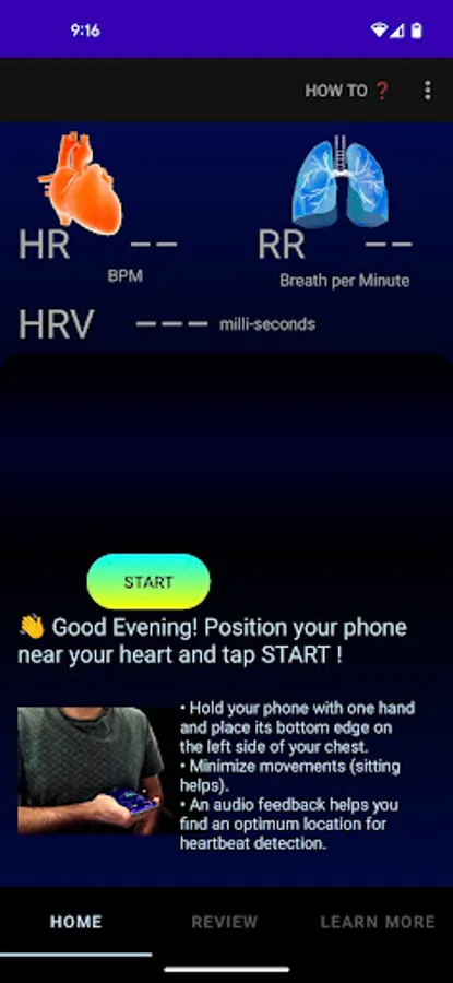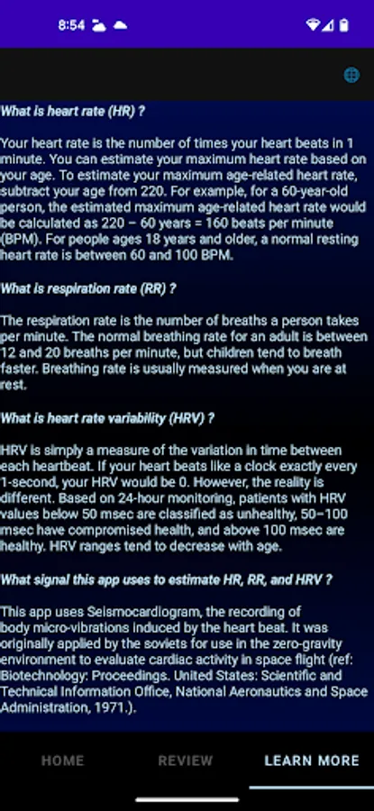 Monitor your heart rate (HR), respiration rate (RR), and heart rate variability (HRV) directly from your chest! You only need to place the bottom edge of your phone near your heart and let the app measure those parameters. The technology used in this app is based on Seismocardiogram signal, the recording of body micro-vibrations induced by the heart beat.