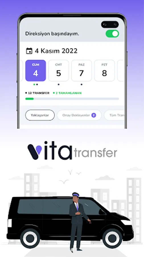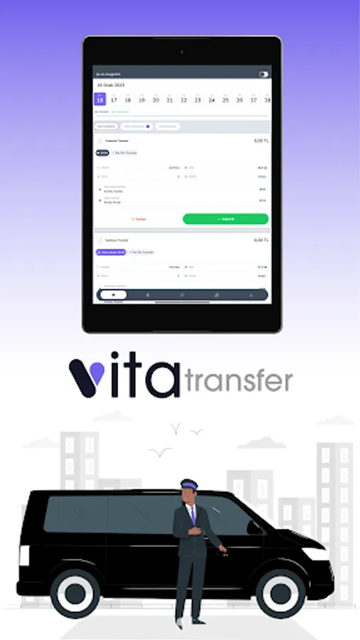 The online marketplace of the road transport industry, vita Drive | Transfer; It is a mobile business tracking and management application developed for VIP transportation, airport transfer, shuttle, taxi transportation drivers and vehicle owners.