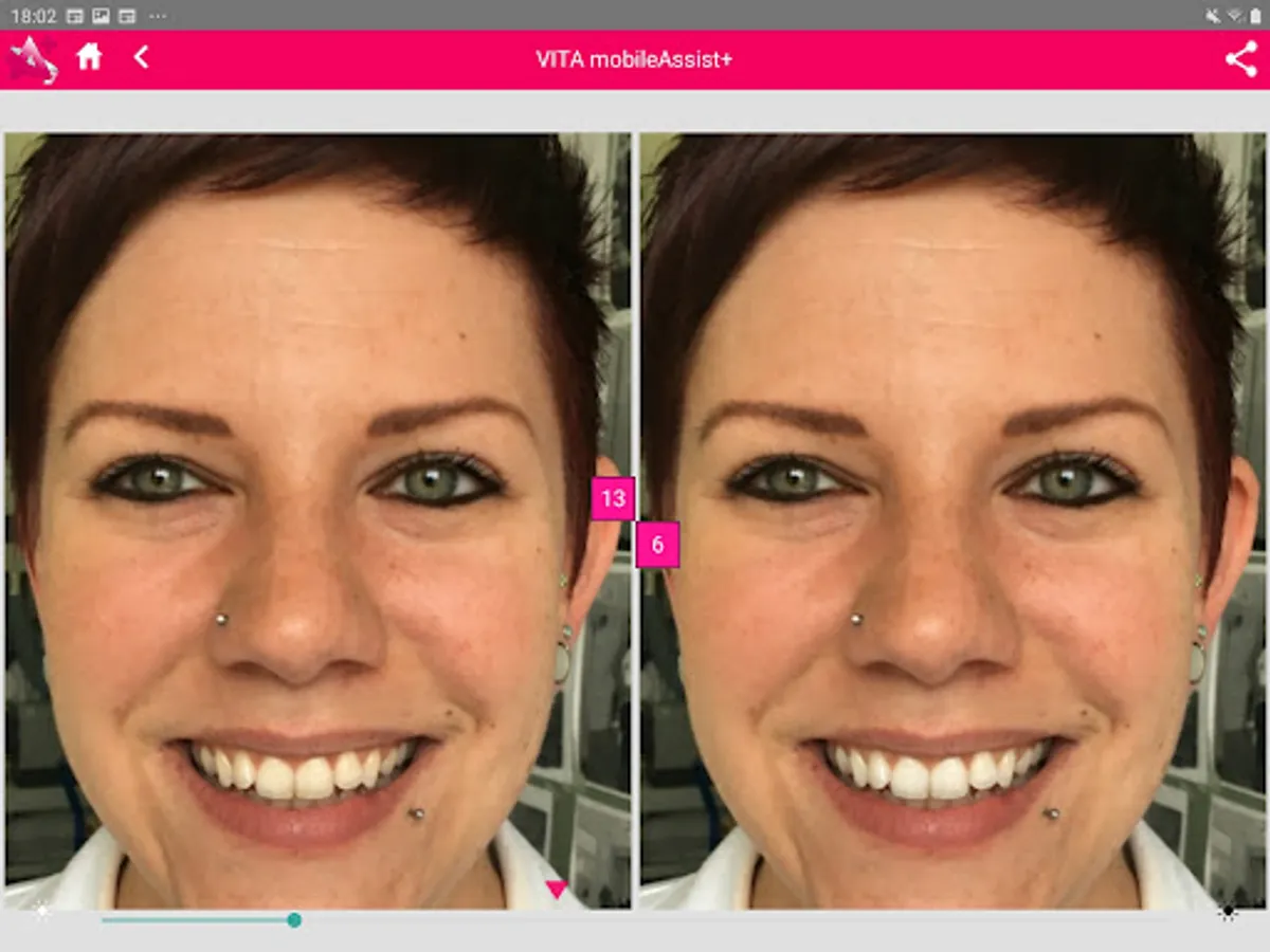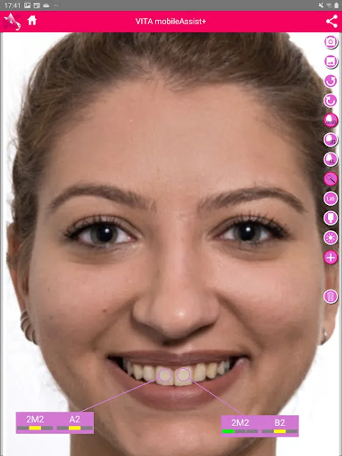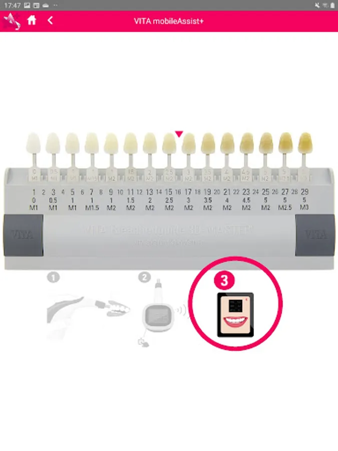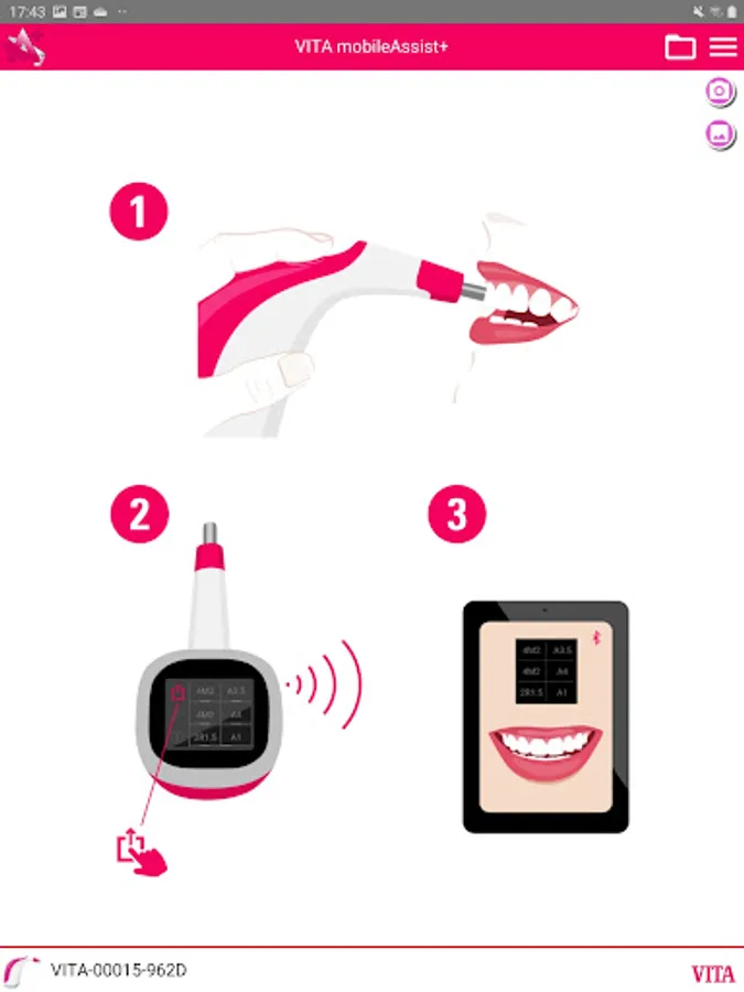 VITA mobileAssist+ enables efficient communication of tooth shade information between dentists and dental laboratories or patients. Tooth shade information measured with the VITA Easyshade V is transferred to the VITA mobileAssist App+ via Bluetooth. This information can be combined with a patient foto to document, save and send the initial situation and individual characteristics of the patient's teeth.