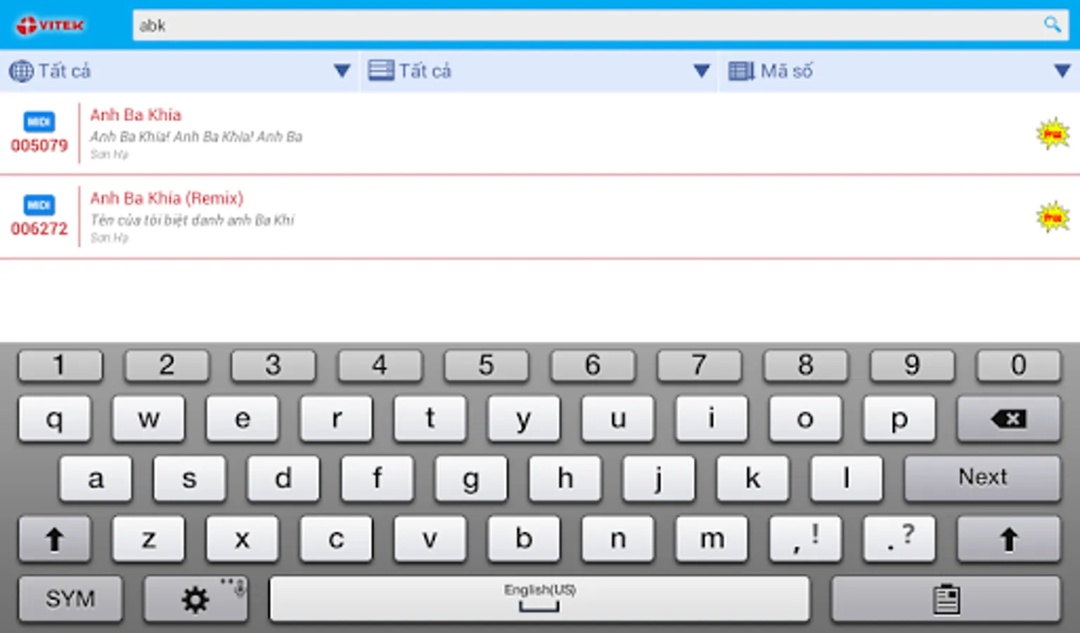 Example: Find the song, "he sesarmid" we enter the key word is "ABK"