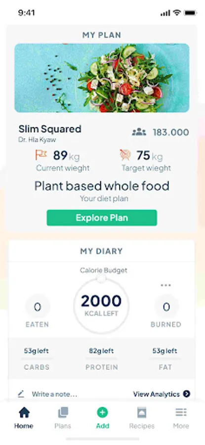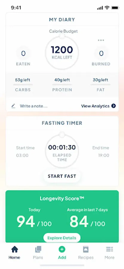 Unlimited health plans with detail recommendations for energy, macros, drinks, exercise, sleep, fasting and meditation.