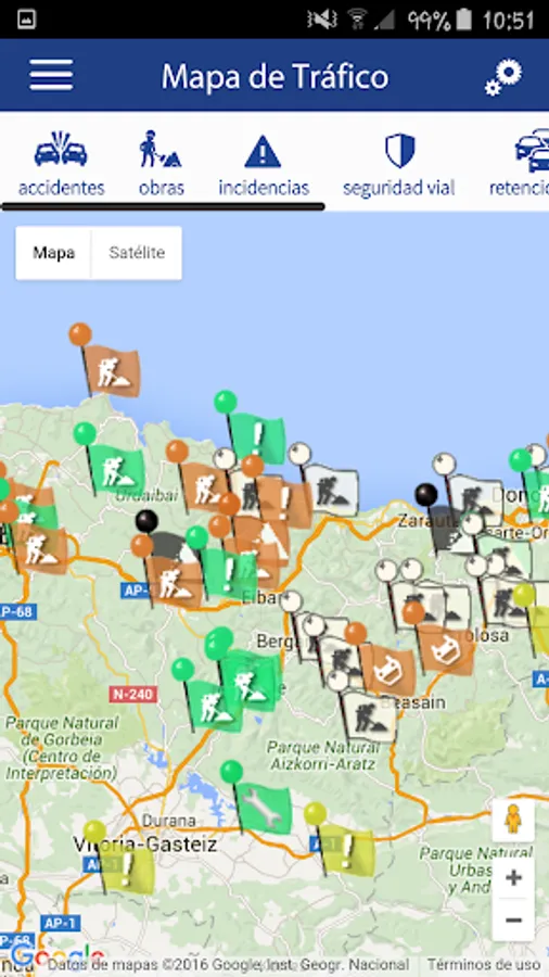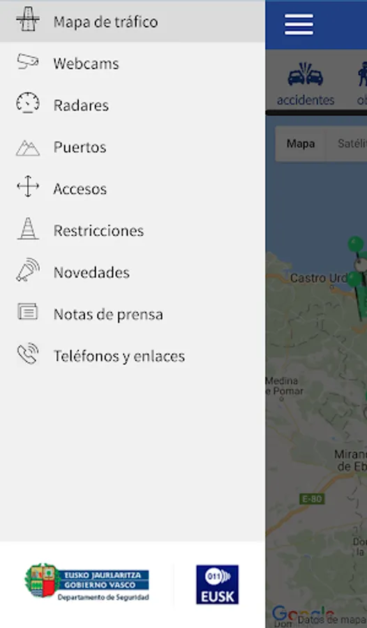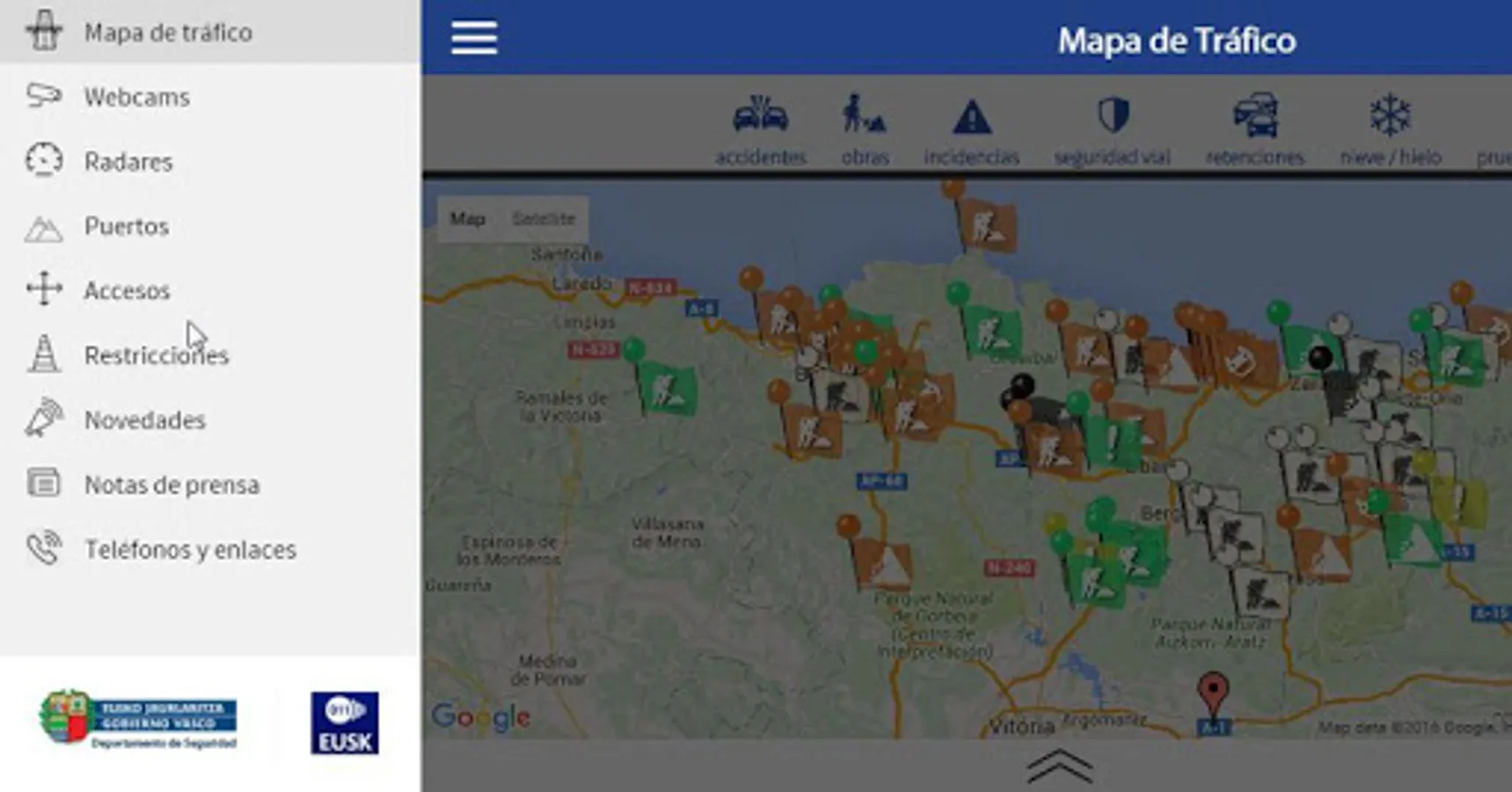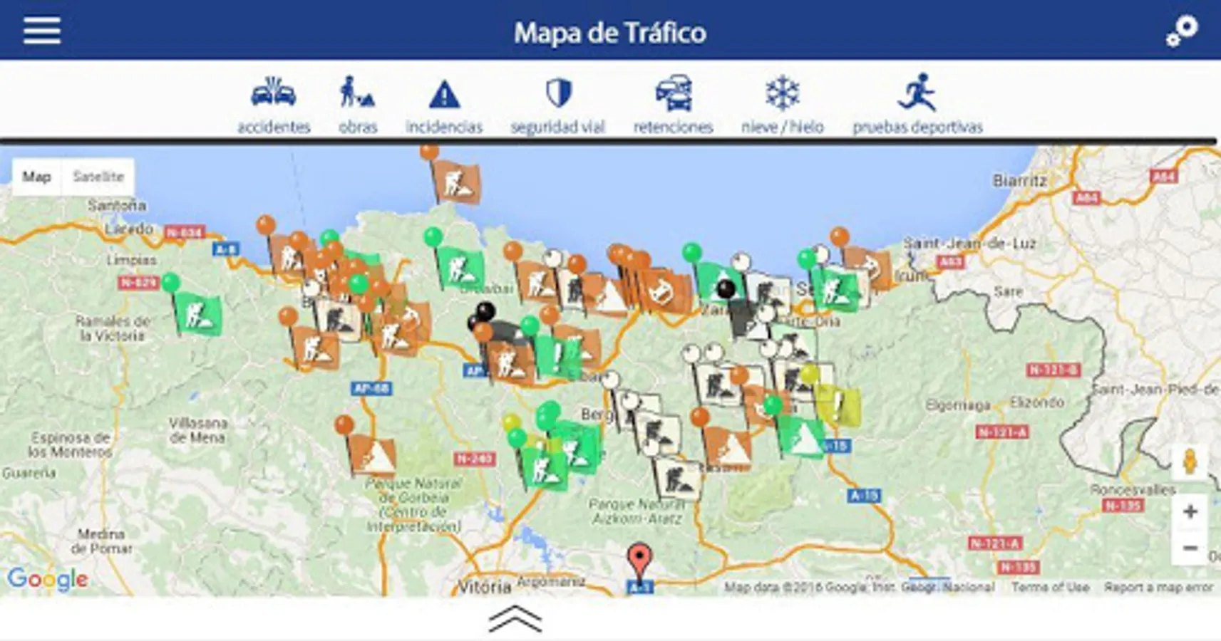 With it you will have access to all relevant information on the state of the roads in Euskadi: incidents, roadworks, radar, traffic cameras, access to capital, state of the mountain passes, restrictions on movement, news, etc. All information is updated in real time from computer systems Security Department of the Basque Government. Besides various links to information of interest and rapid officers and emergency phone traffic information access are offered.