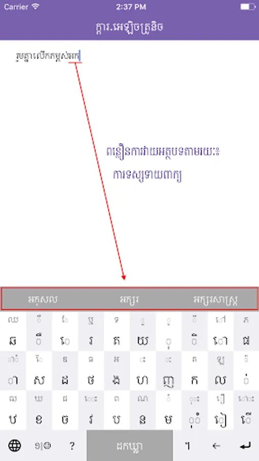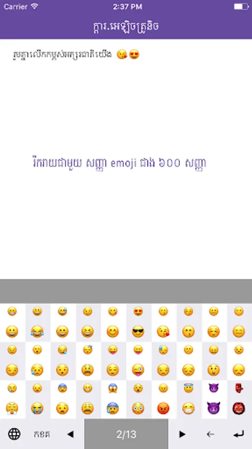 Khmer eKeyboard is an application which helps users to type Khmer text more easier and faster on their smart phone and tablet. The application is designed in the purpose of increasing the use of Khmer text in any areas especially in social network context like Facebook.