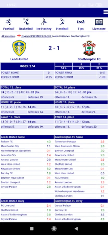 INDEX is based on two main components that build background for our betting tips – current form and power of every team. Current form is calculated from last 6 played games. Power is calculated separately for home games and away games.