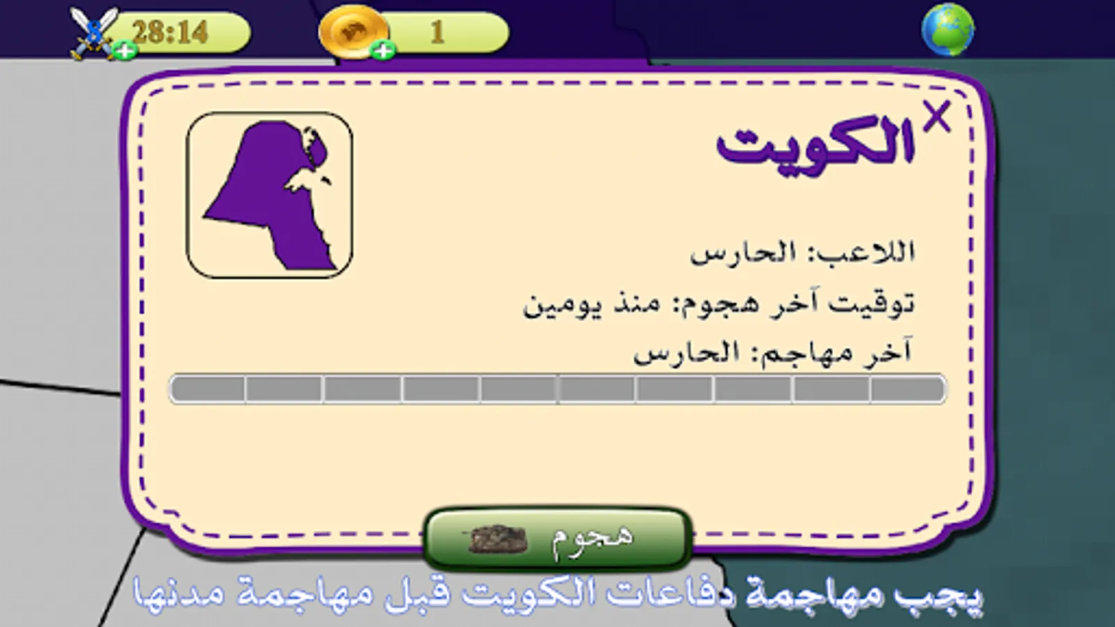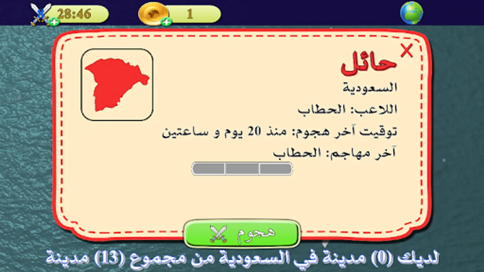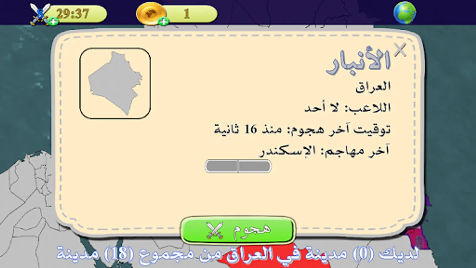 Occupied game based on general culture, the game contains the cities of the Arab world (other countries will be added at each game update) When you click on a city a set of questions will appear to be solved and occupied.