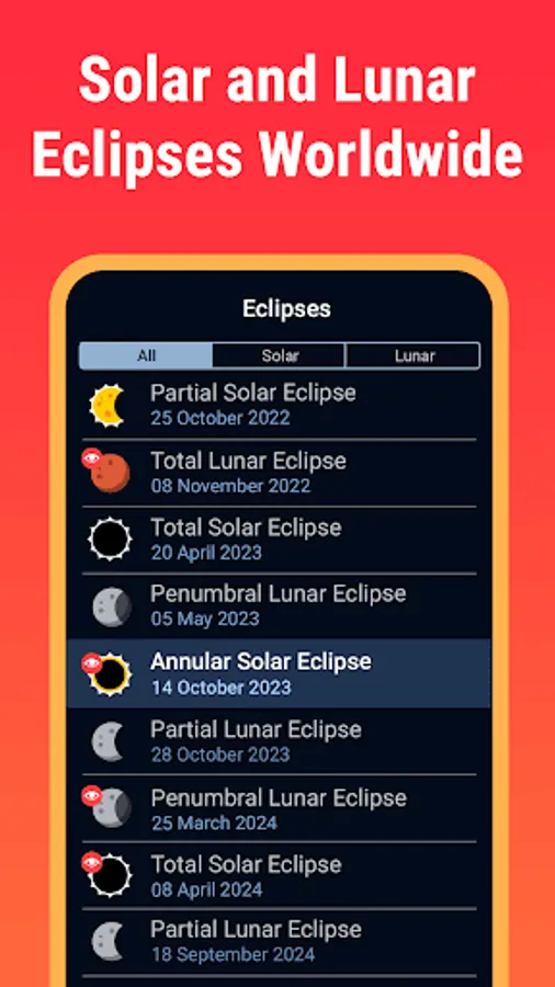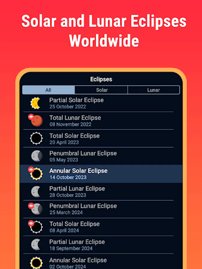 You will never miss solar and lunar eclipses will Eclipse Guide app. Eclipses of 2022 and other years are available in our comprehensive eclipse calendar. Get timely push notifications for these astronomy events.