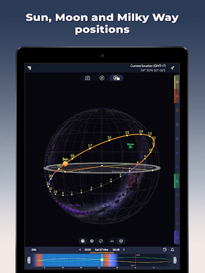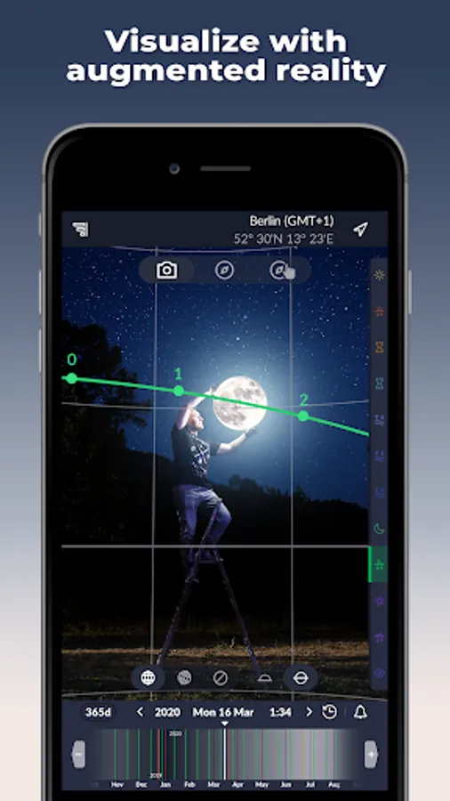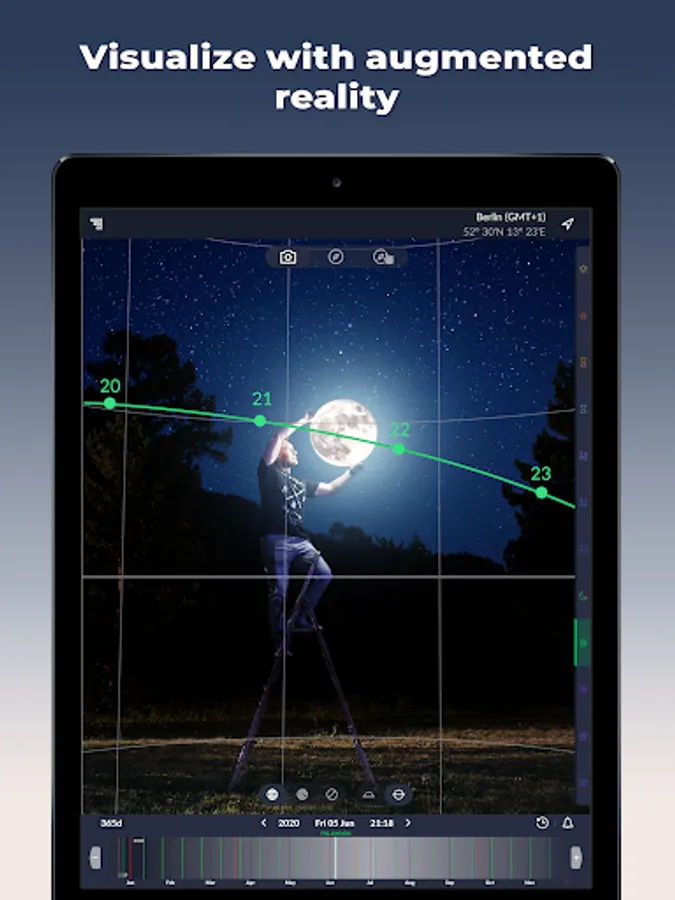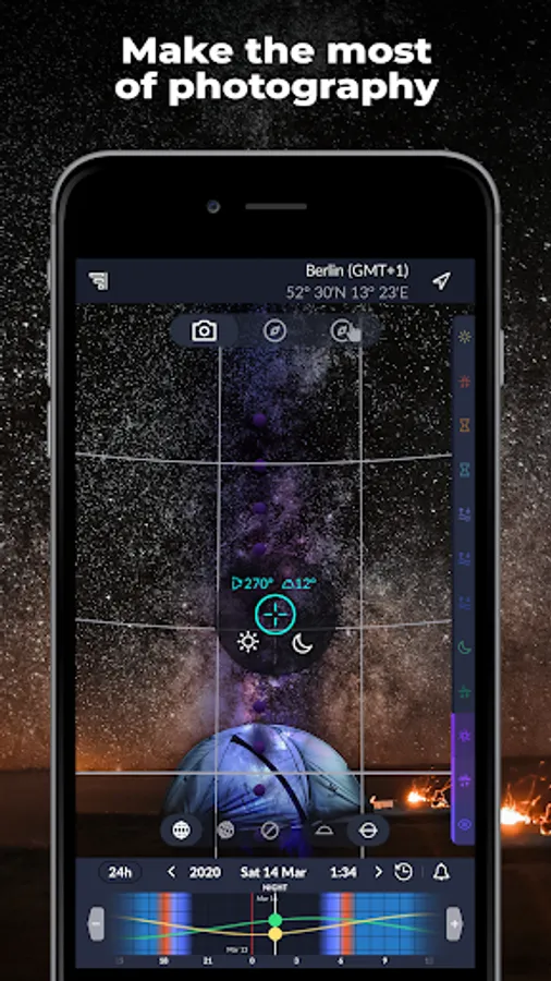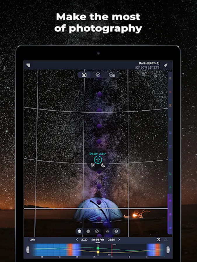 The app contains comprehensive ephemeris for the Sun, the Moon and the Milky Way. Use the AR live view, 3D compass, time machine, sun and moon calendar, sunrise and sunset time notifications, lunar and solar calculator, milky way finder and other features to plan photography effectively.