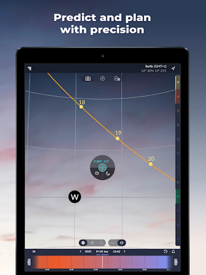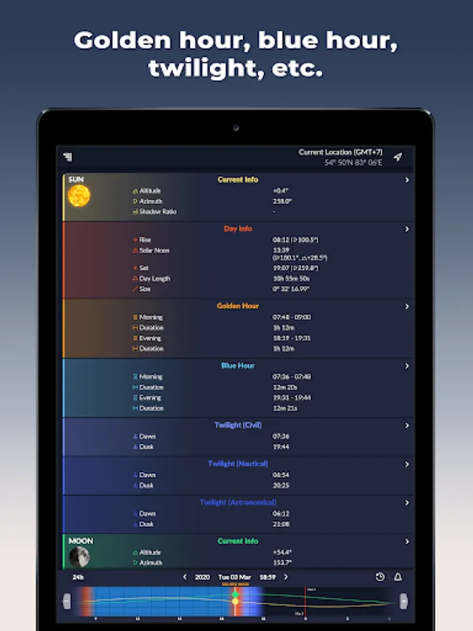 A must-have app for photographers to get the perfect shot. Plan ahead, visualize and predict the position of the Sun and the Moon, the Milky Way, sunrise and sunset times, golden hour, blue hour, twilight and other special moments for stunning photos.