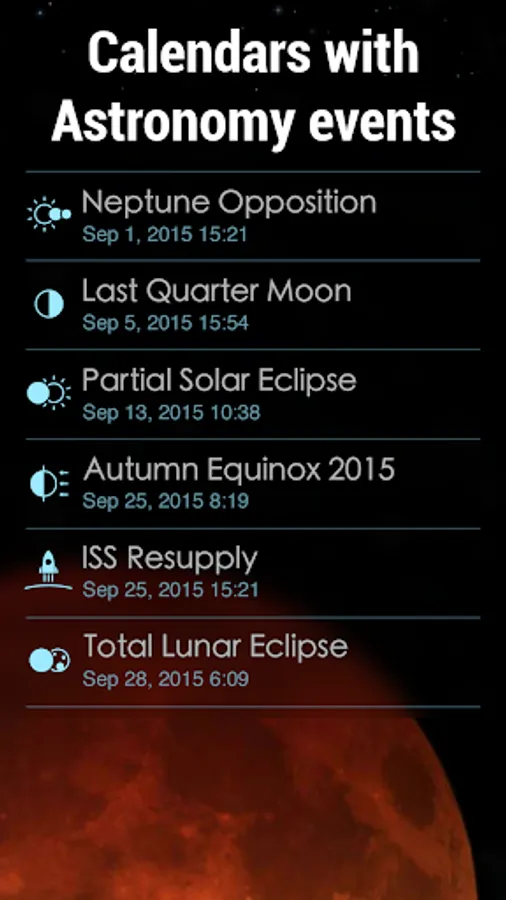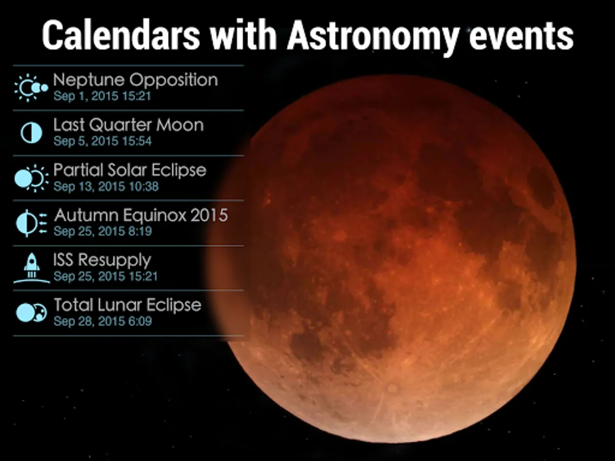 To explore space in details use the celestial event calendar that includes various astronomy events (solar, lunar eclipse, the moon phases), and events related to space exploration (launching of satellites, etc). Exploration of our Solar system model is easy with Solar Walk 2.