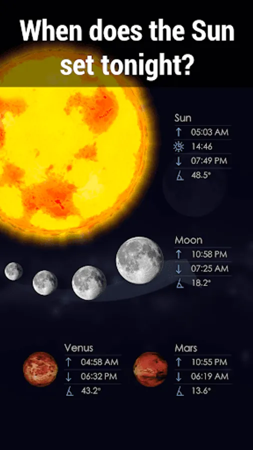 ★Be aware of the latest news from the world of outer space and astronomy. The "What's new" section of our stargazing app will tell you about the most outstanding astronomical events in time.