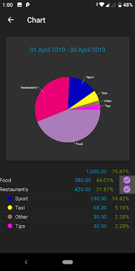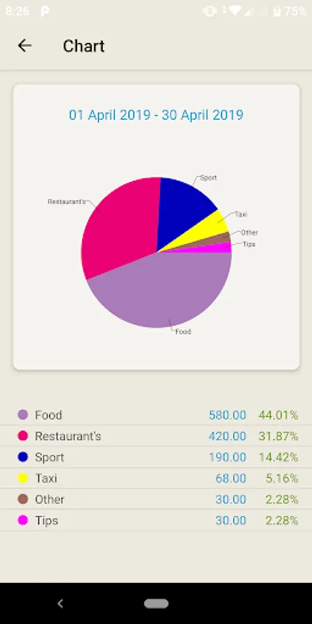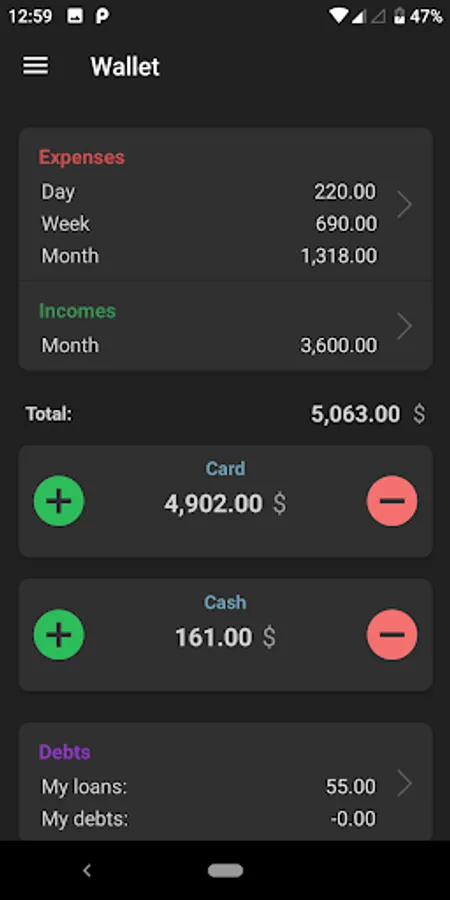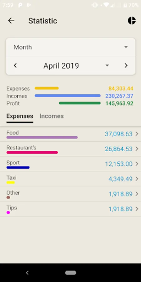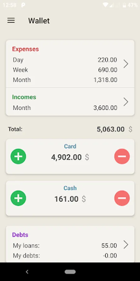 Record all expenses during the day, and the application will show you where your money went on a clear graph and chart. You can see the statistics of expenses and income for the day, week, month, year and for the specified period.