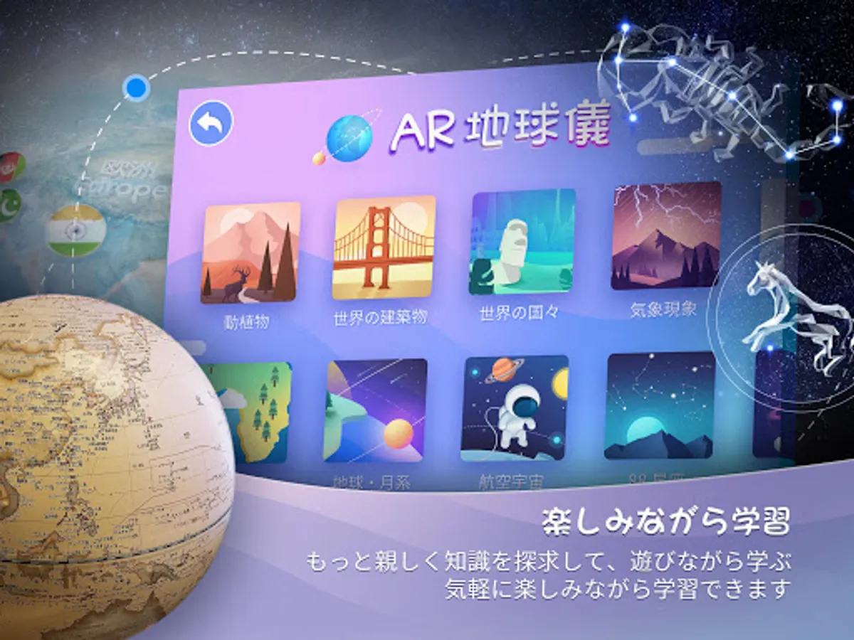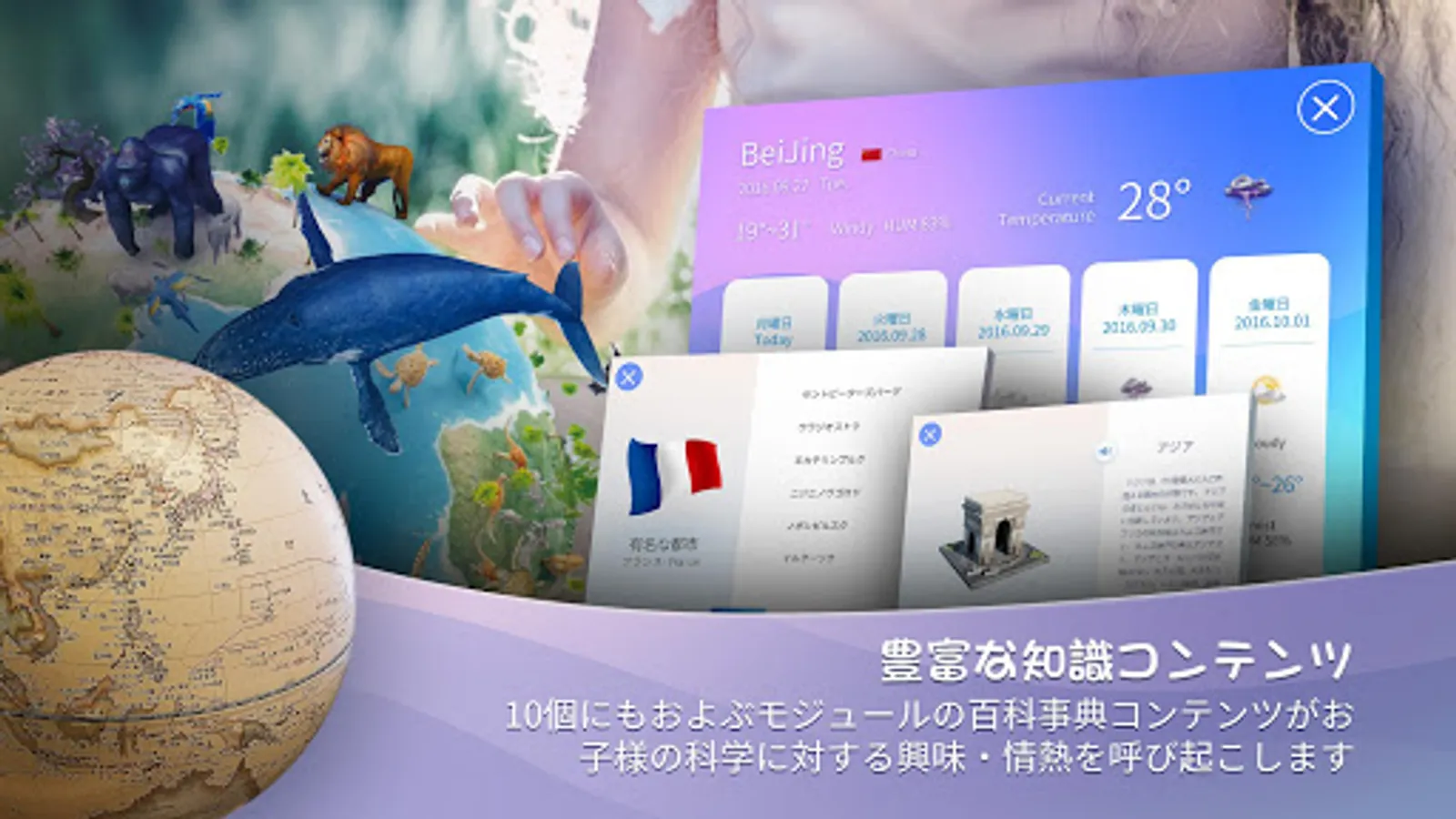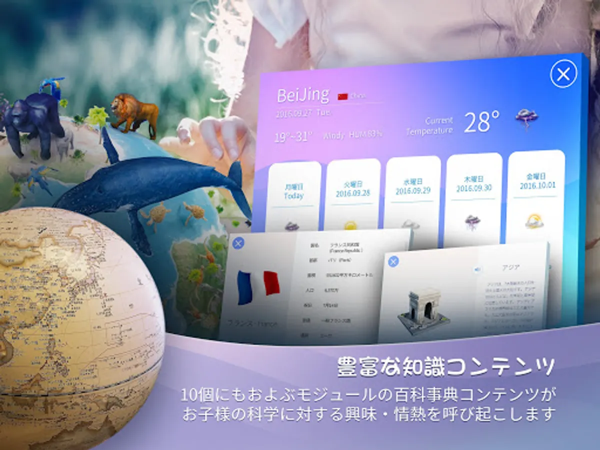AR (augmented reality) by combining the technology and globe model, we have the video and the sound was realistic 3D three-dimensional model, lively. Use a wide variety of information, and provides to learn a wealth of knowledge through a completely new experience and play to children.