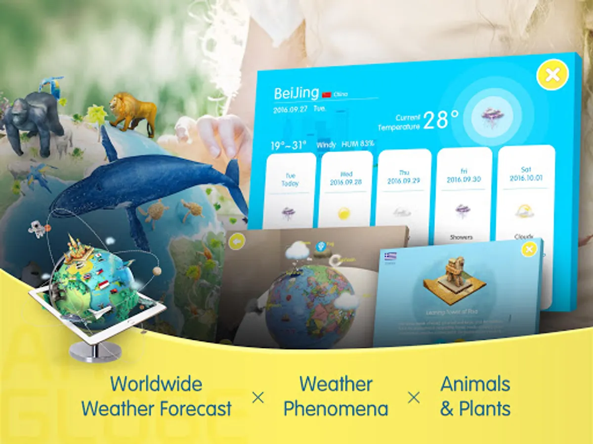 By engaging the modern technology of AR (augmented reality) with classical globe, we are able to bring children a brand new experience : realistic 3D objects with animations and sounds are presented according to geographical information, allowing children to learn comprehensive knowledge while play.