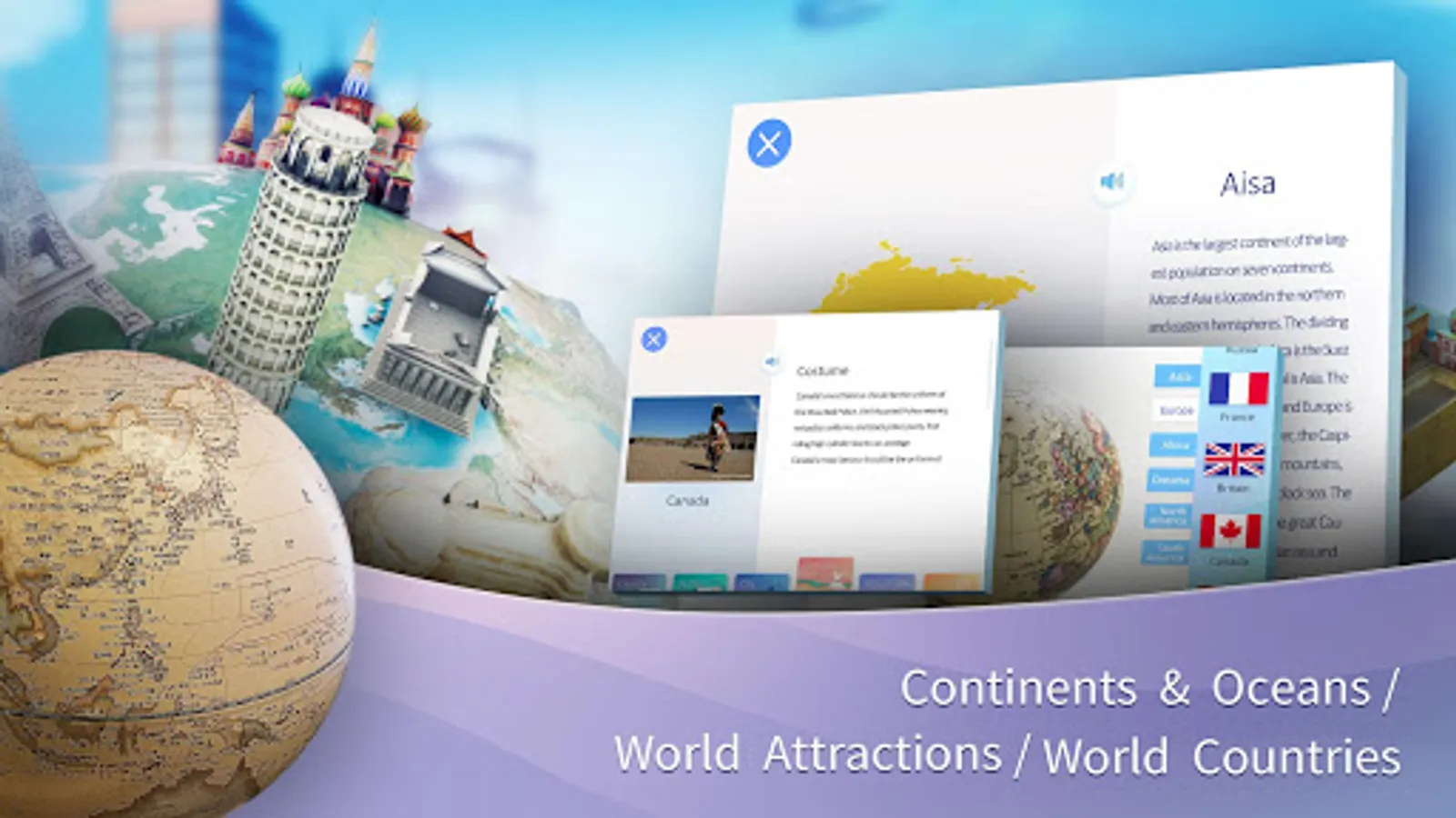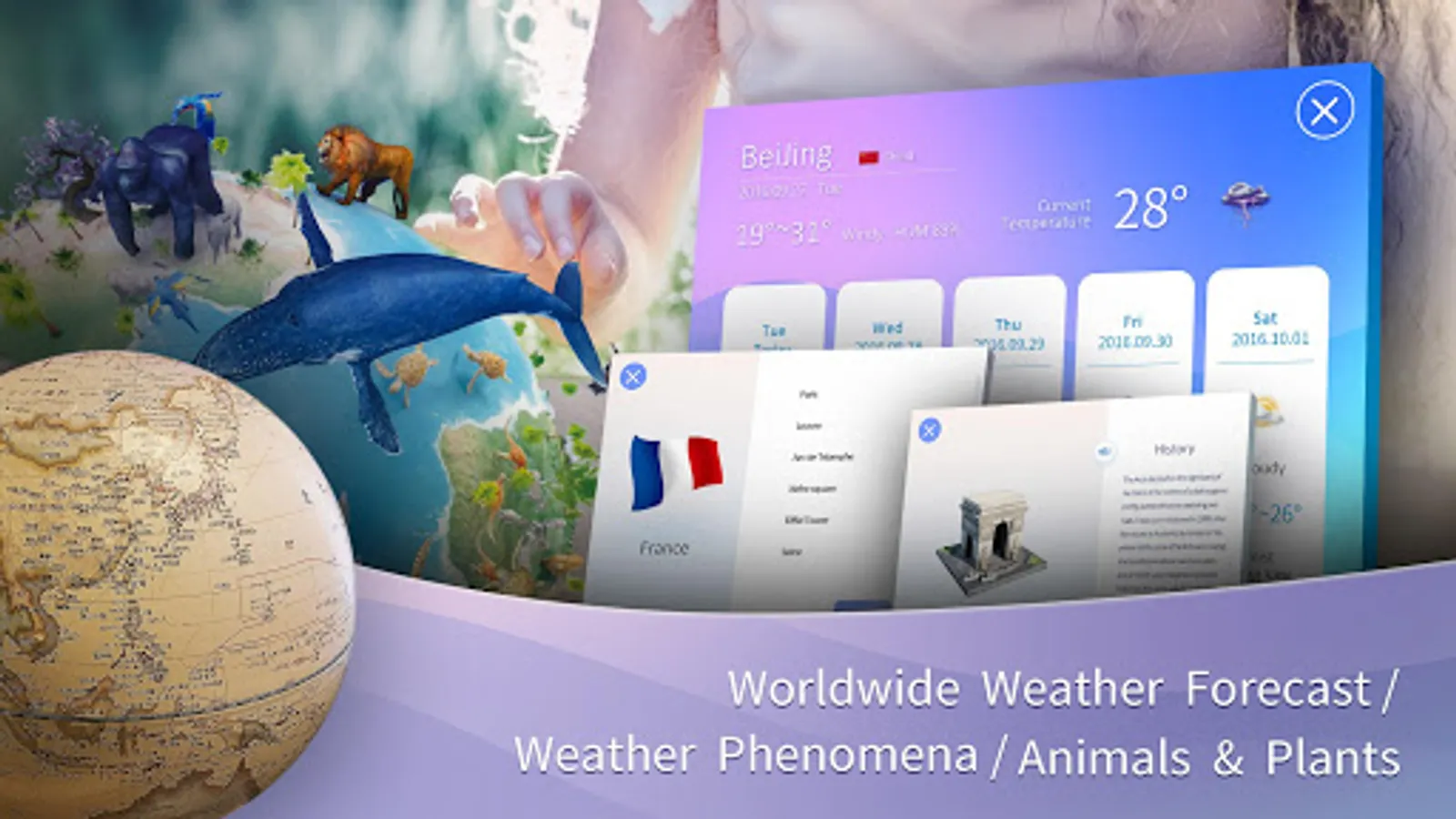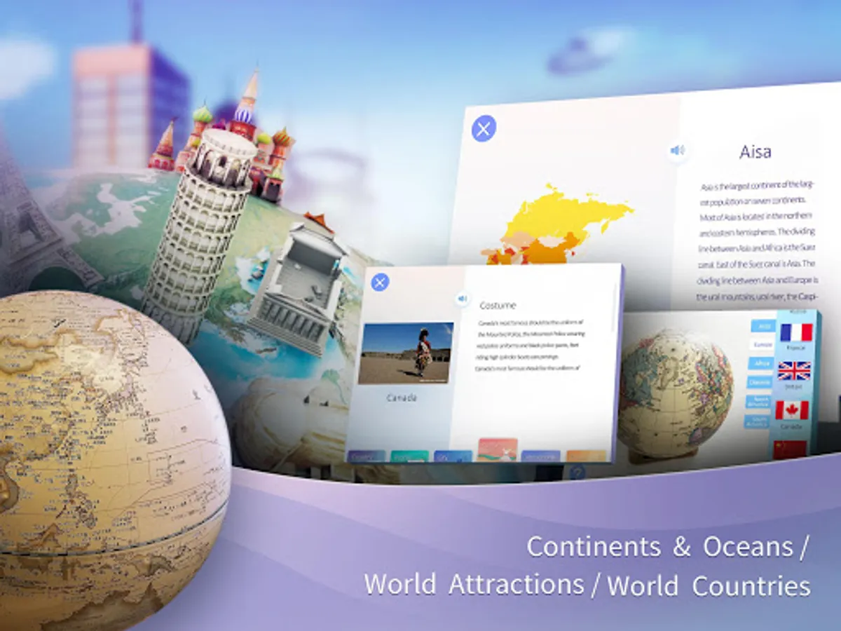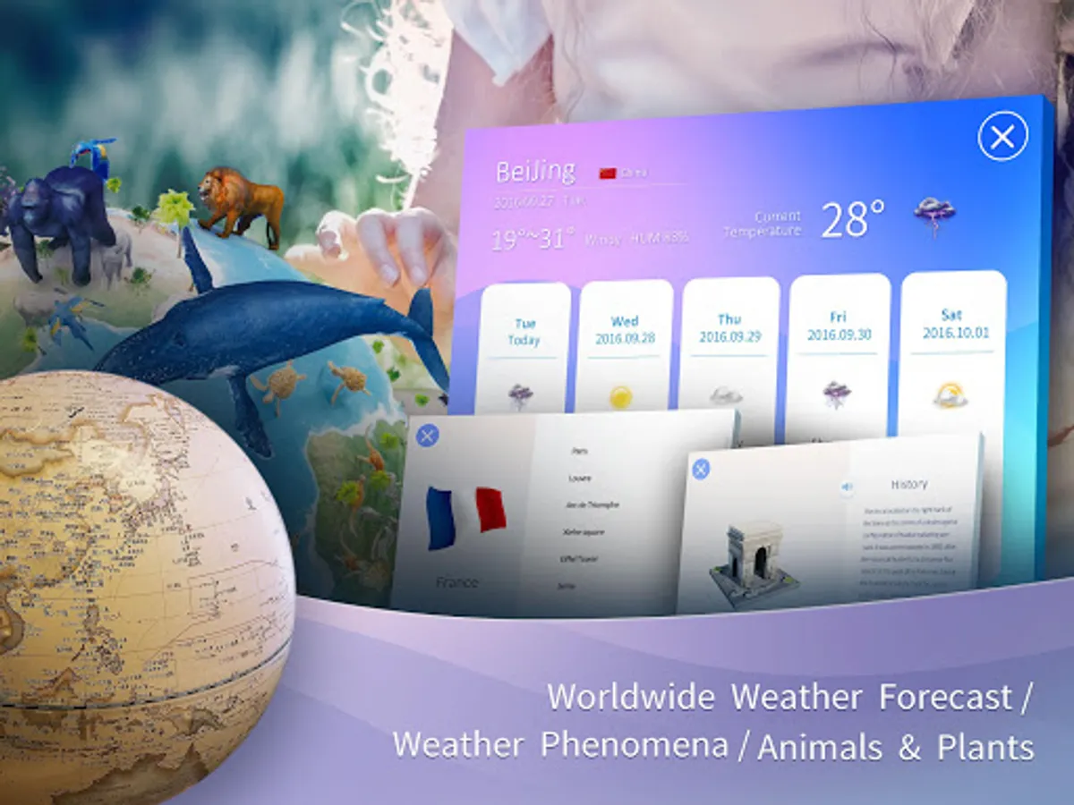 By engaging the modern technology of AR (augmented reality) with classical globe, we are able to bring children a brand new experience : realistic 3D objects with animations and sounds are presented according to geographical information, allowing children to learn comprehensive knowledge while play.