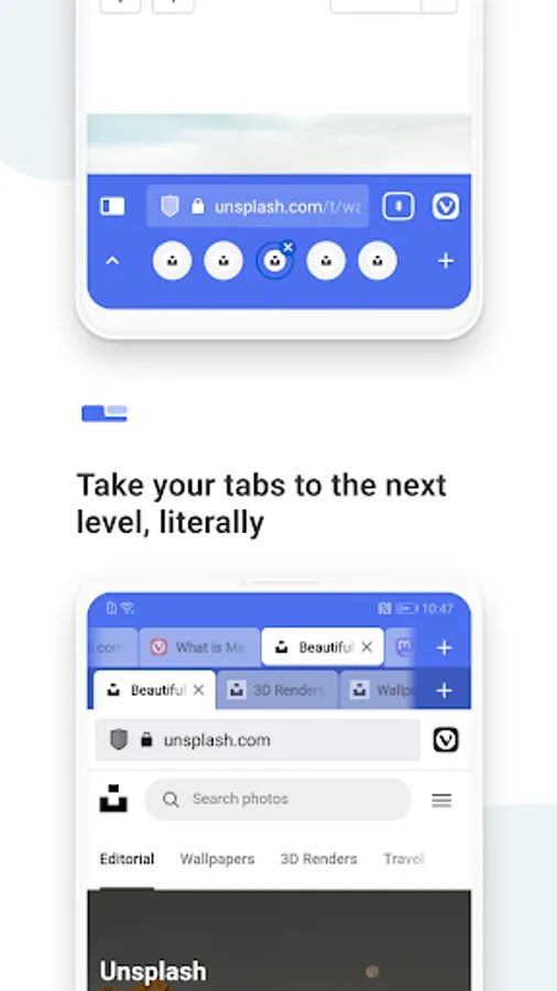 Vivaldi is the world’s first browser on Android to introduce two rows of mobile browser tabs. Long-press the New Tab button & select “New Tab Stack” to check it out! Choose between using a Tab Bar (which works great on larger screens and tablets) or a Tab Switcher to manage tabs. In the Tab Switcher you can quickly swipe to find open or private tabs and tabs you’ve recently closed in the browser or have opened on another device.