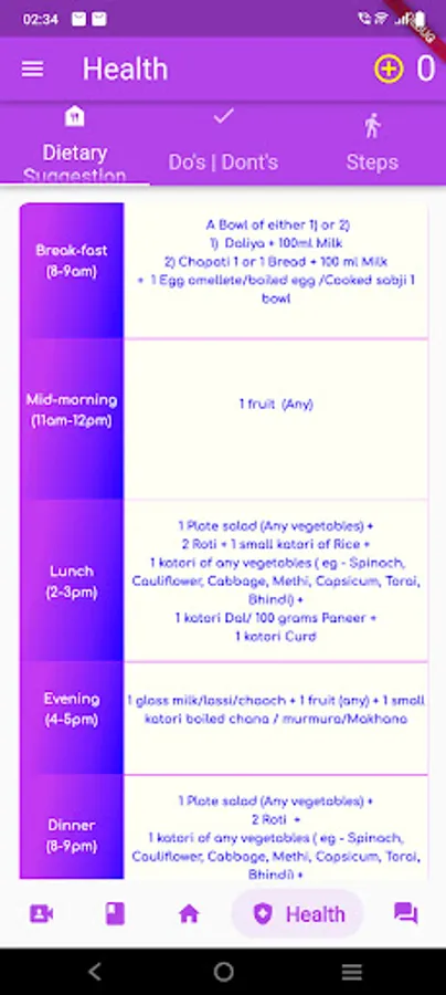 The health page will include 3 components: do’s and don’ts, dietary suggestions, and steps counter/calories based on which points will be given (e.g. +1 point for 10,000 steps a day). In-App purchases will be added in the future to unlock more such health metrics.