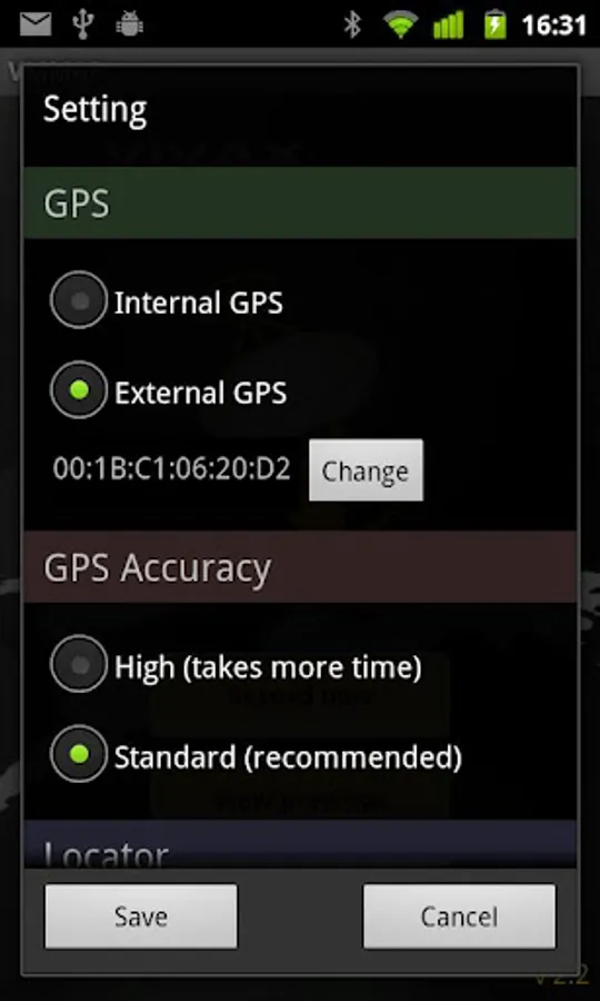 1. Bluetooth connection with locator receiver and have the ability to choose to use either internal GPS on the device or external GPS.
