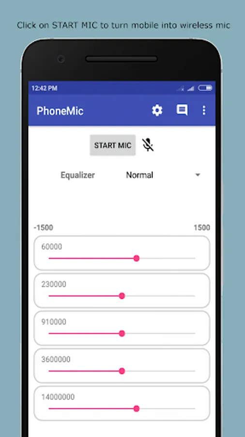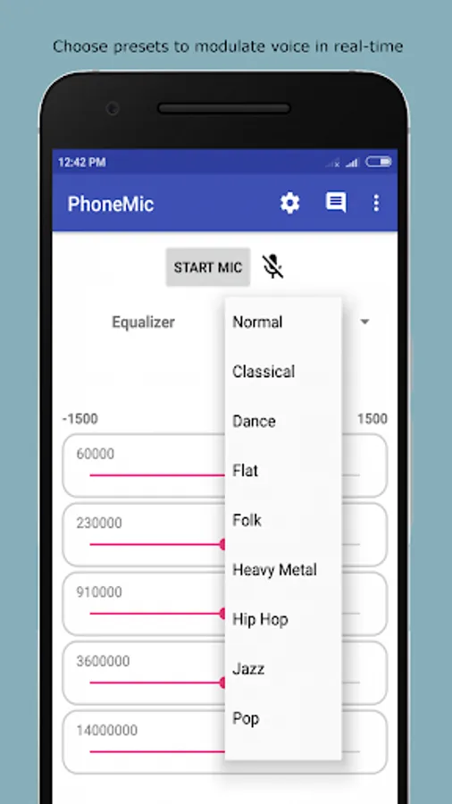 Connect you phone to a loudspeaker via bluetooth or mobile jack. And your mobile would convert into a Mic/Microphone. There is equalizer support in the app to modify some frequency components of your speech. You can also choose from given presets like Jazz, Pop, Rock, etc.