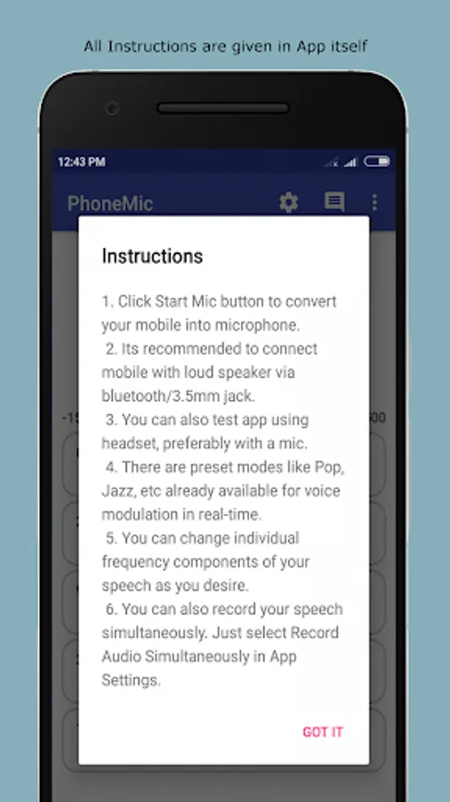 After you have this App, you would not require an actual mic for any purpose. This app is essentially a wireless/portable mic/microphone.