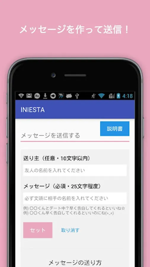 Function of Iniesta, is to display a message that you create to itself. First, create a message, he to pass the smartphone are prepared such as photos, will be displayed when you are looking at. At this time, sat down face to face with him, smartphone is so that only he sees. Now he is, know your feelings by looking at accidental messages addressed to you from your friends, you can confess.