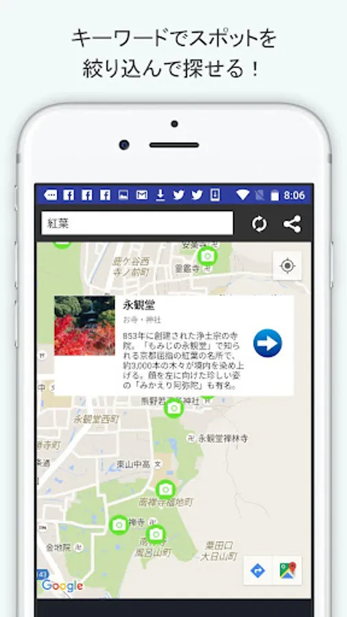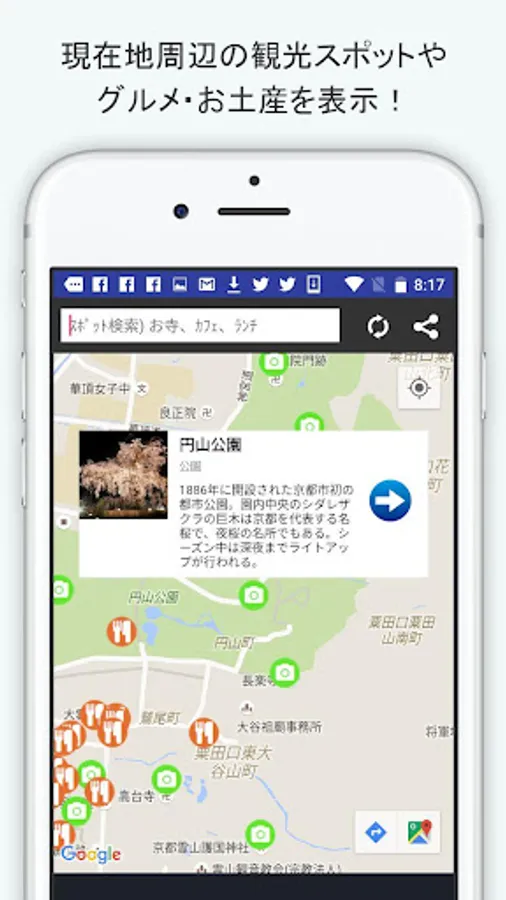 アプリを立ち上げると現在地の地図が表示され、周辺にある観光名所やお店のアイコンが表示されます。アイコンをタップするとそのスポットの基本情報が、さらにタップすると詳細情報が表示されます。