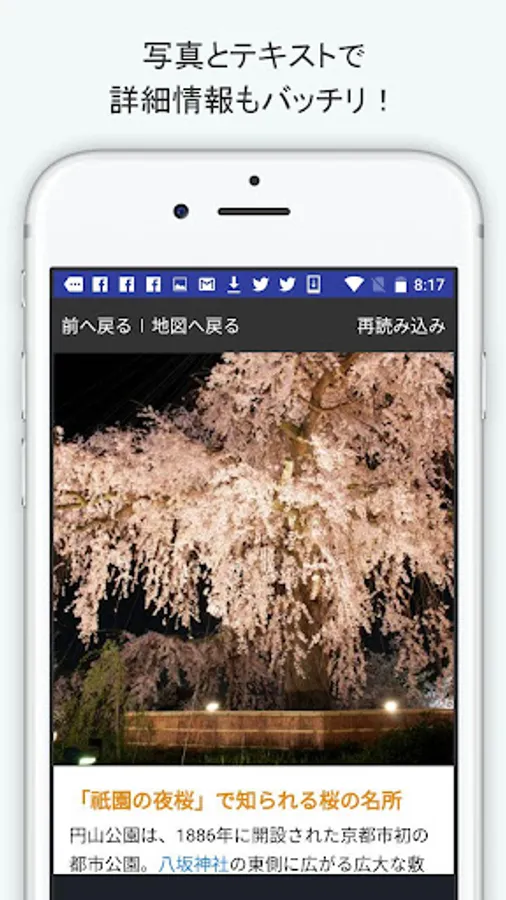 「桜」「紅葉」「スイーツ」「ランチ」「パワースポット」など、好きなキーワードで周辺のスポットを検索できます。例えば「桜」や「紅葉」で検索すれば、今いる場所の周辺で桜や紅葉が見られるスポットだけが表示されます。