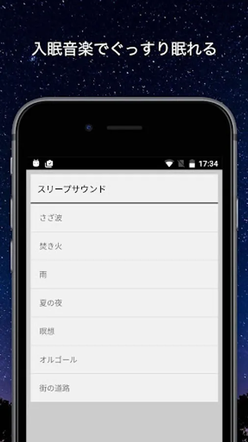 ・スリープタイマー(さざ波・焚き火・雨・夏の夜・瞑想・オルゴール・街の道路の7種類の入眠音楽)