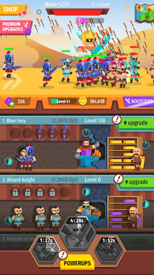 Train and hire blacksmiths so we can equip our warriors with the best weapons we can craft. As you improve your idle forge, our troops will get epic gear to put in their inventory slots - new armour for health, new swords for attack, new staves for magic.