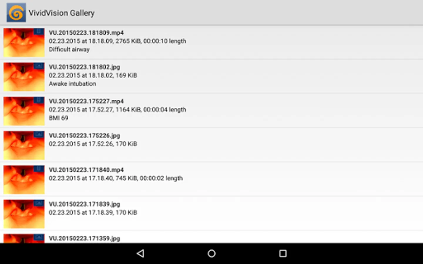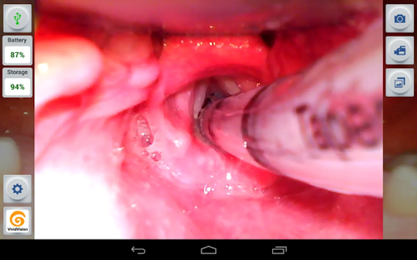 VividVision supports the display of the video image of a USB connected VividTrac (VT-A100 and VT-P100) single-use video laryngoscope device. After startup of the application, VividVision has the capability to auto-detect the VividTrac device upon plug-in, and display the video image automatically. VividVision supports video recording, and the ability to save snapshot images on the Android device as needed.