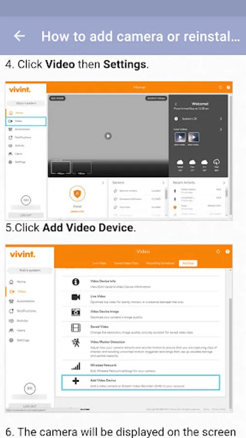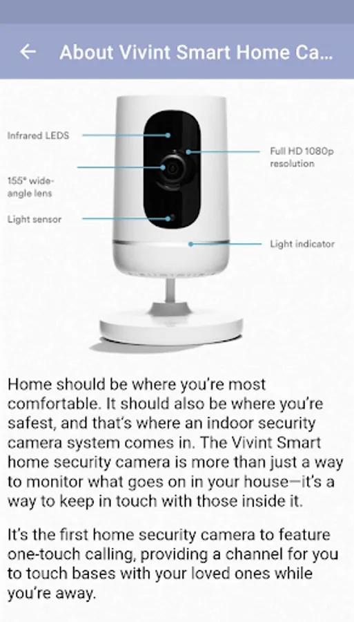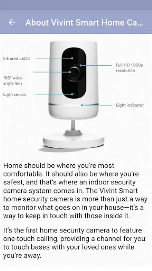 You can learn about the features and setup of Vivint Smart Home Camera from the app. It captures images when motion is triggered and you can also see and talk to family members or pets directly through the Vivint Camera. Night vision gives you a crystal-clear view inside your home, day or night. The Vivint Indoor Camera records video in high definition to capture every detail, while its wide-angle lens lets you see the whole room.