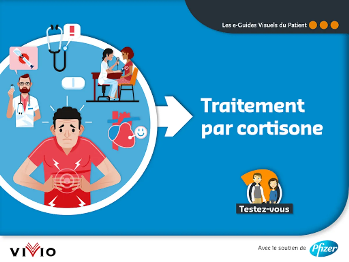 The e-Visual Guide of the Patient Treatment by cortisone is an application which allows you to better understand the cortisone treatment, in a didactic and interactive way. The e-Visual Guide to Patient Cortisone Treatment was developed by ViVio, with the support of Pfizer.