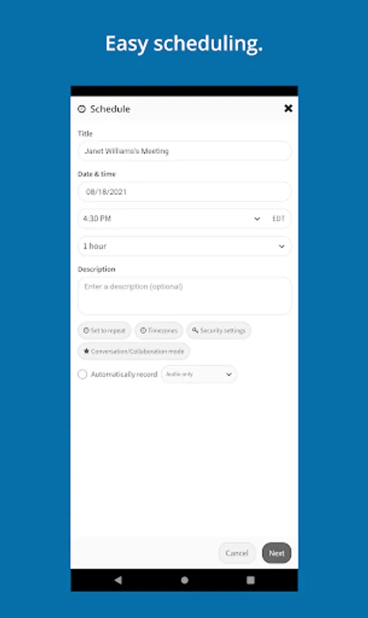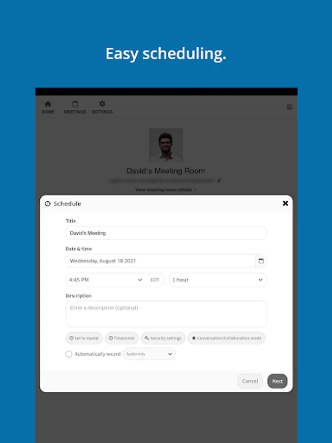 ● Schedule calls on the go or start a call on-the-fly with the click of a button