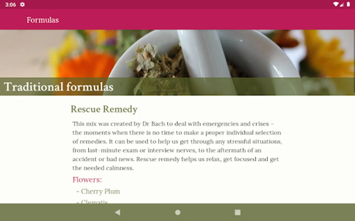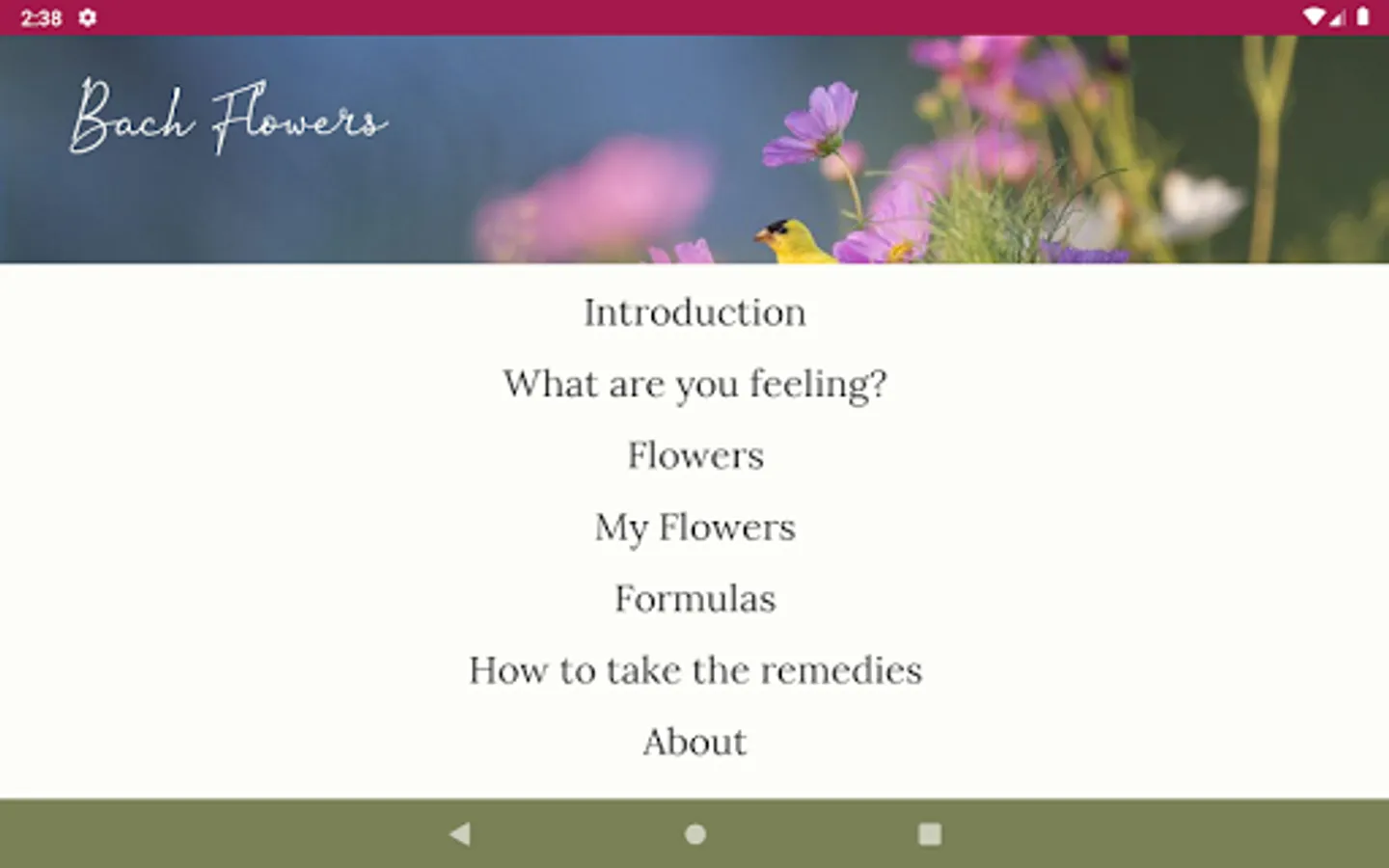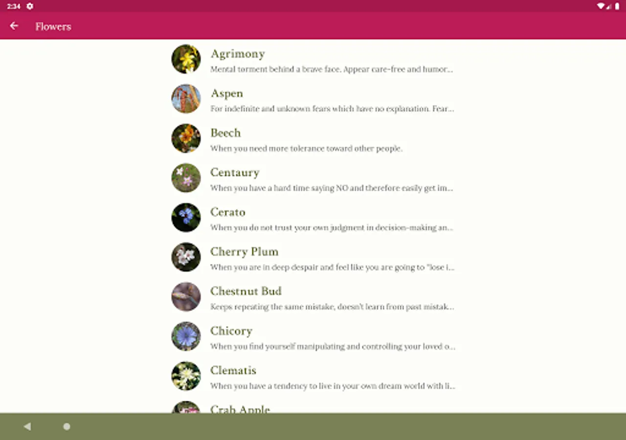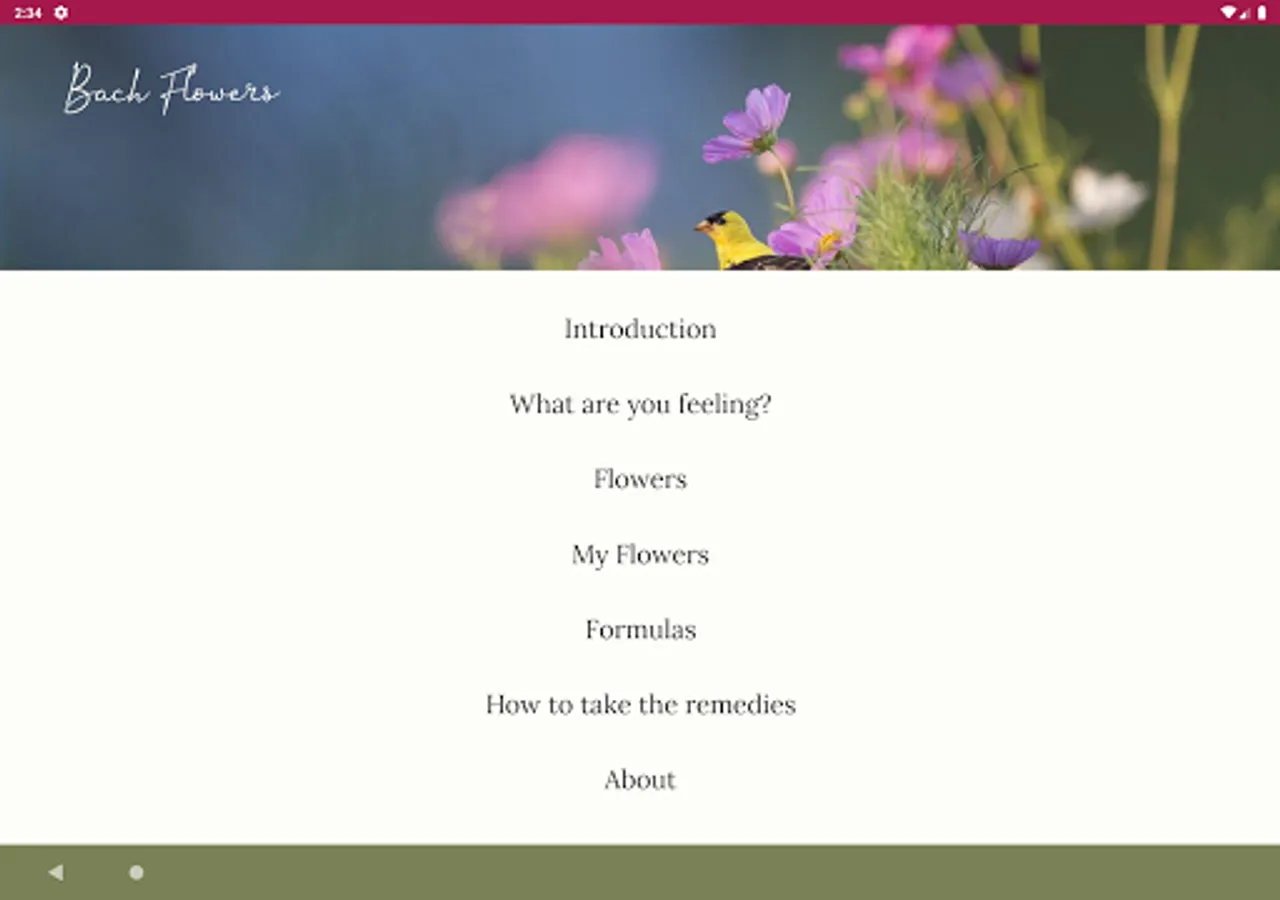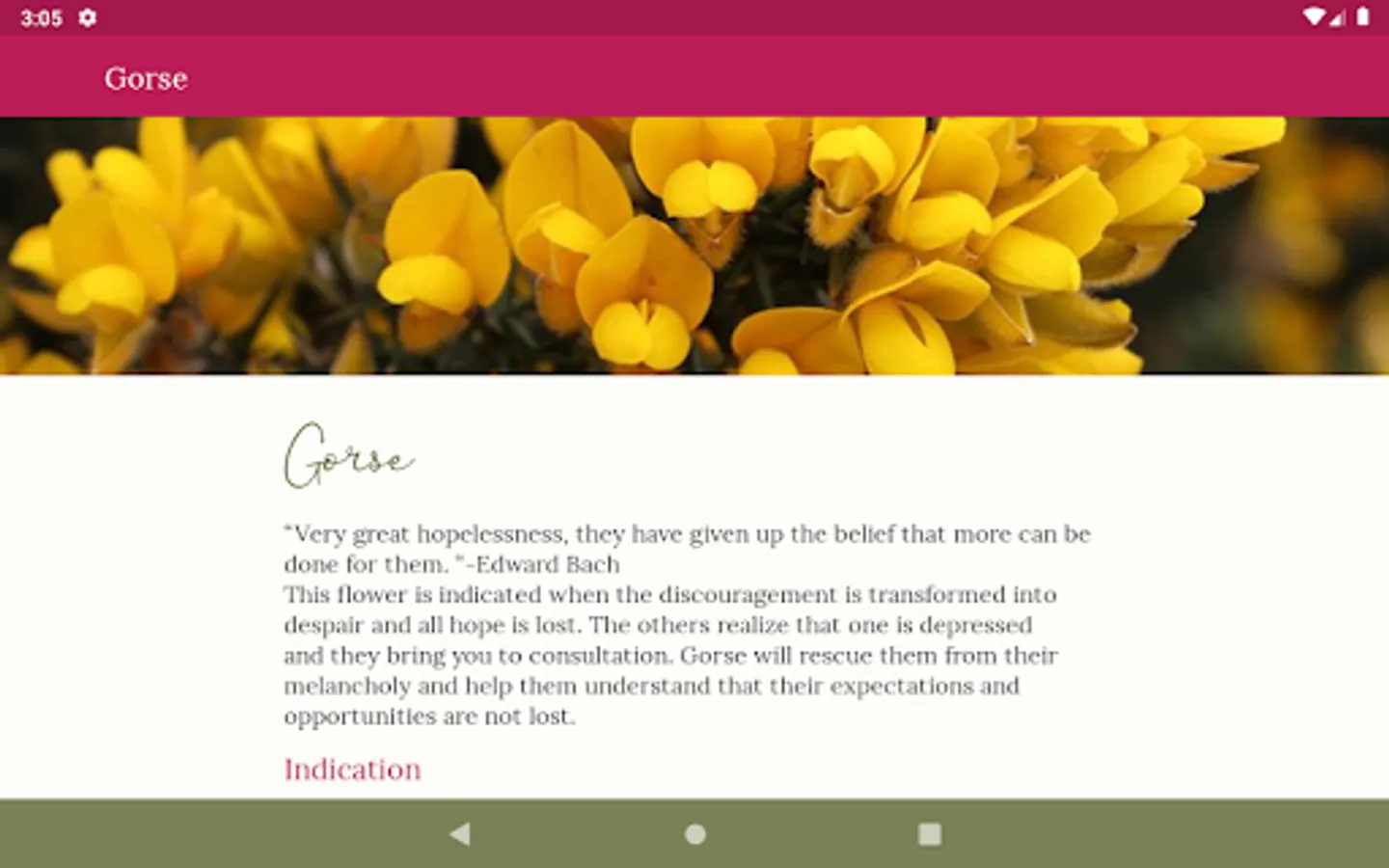This application seeks to help professionals and the public in general, to find more easily the flowers that best suit their needs, respecting the principle of "simplicity" of Dr. Bach. Whose central message was: "We are all healers." It was the will of Dr. Bach that anyone could prepare their own treatment and that is why he created a simple choice of flowers. Even so, it is always advisable to go to a professional therapist when the problem is chronic.